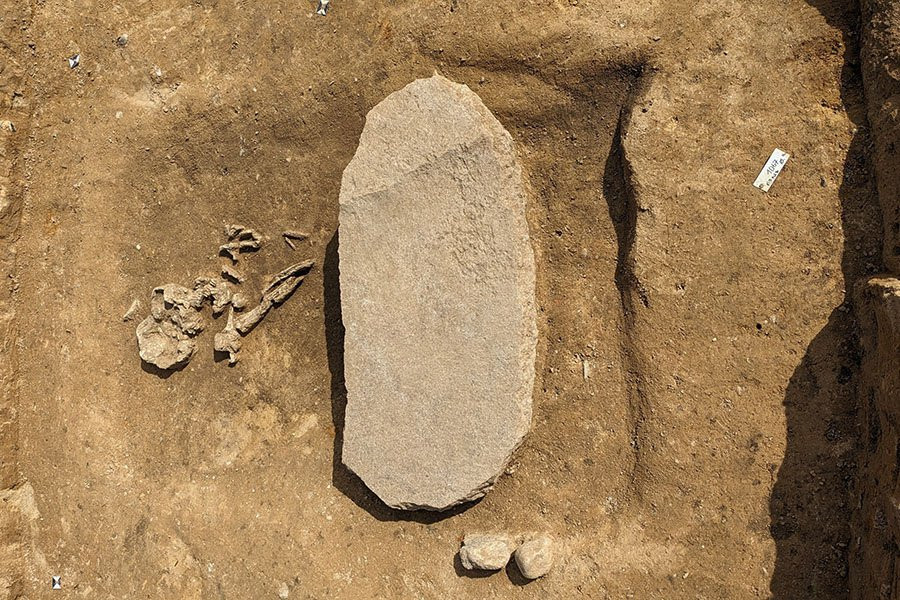В ходе раскопок перед началом работ по расширению линии электропередачи была обнаружена могила взрослого мужчины в возрасте от 40 до 60 лет. Никакого инвентаря при нем не было захоронено. Его положили на левый бок, с согнутыми ногами и большим камнем поперек голеней. Камень имеет длину около 1 метра, ширину — почти полметра, высоту 10 сантиметров и весит 50 кг. Большой вес и широкое основание были предназначены для того, чтобы покойный не смог подняться из могилы.