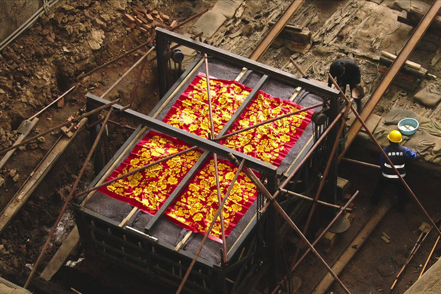 Массивная гробница весом 16 тонн была поднята из глубокой ямы в комплексе мавзолея Цинь Шихуанди, первого императора Китая, чья гробница, как известно, охраняется армией терракотовых воинов в натуральную величину численностью 6000 человек. В ней были обнаружены очень богатые погребальные находки, в том числе оружие, доспехи, нефрит, пара золотых и серебряных верблюдов, набор кухонной утвари и 6000 бронзовых монет. Такое грандиозное захоронение, покойный, должно быть, был воином высокого ранга, возможно, даже одним из сыновей императора Цинь.
