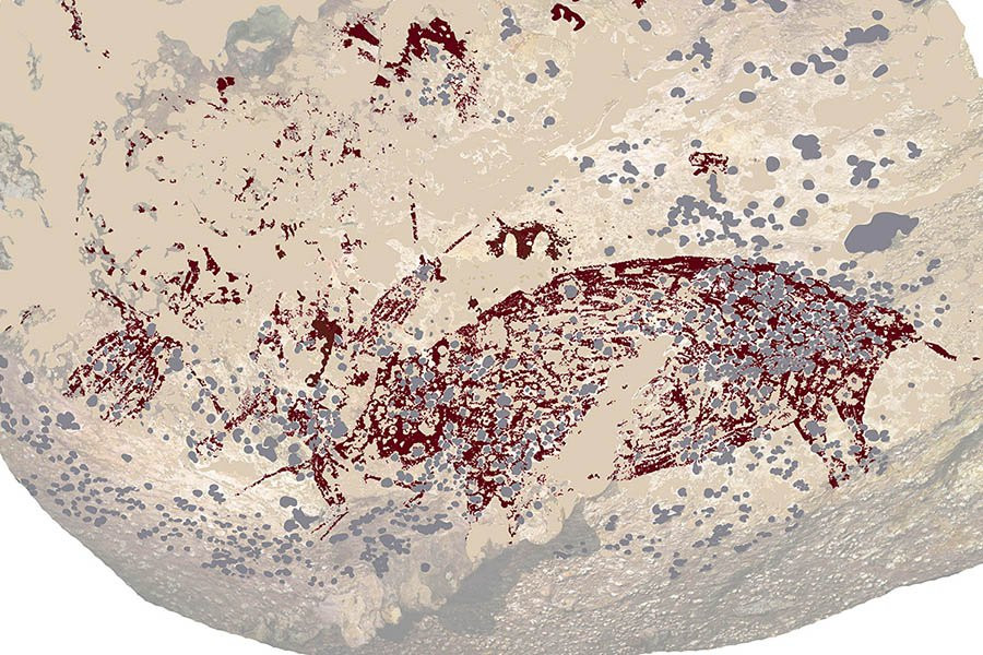 Недавно датированная картина, находящаяся внутри известняковой впадины под названием Leang Karampuang на индонезийском острове Сулавеси, изображает то, что, вероятно, является сулавесийской бородавчатой свиньей, окруженной более мелкими фигурами, похожими на людей или гибриды человека и животного. На протяжении тысячелетий атмосферные условия усеивали картины беловатыми комками карбоната кальция, которые археолог из Университета Гриффита Адам Брамм, соавтор новой статьи, называет «пещерным попкорном».