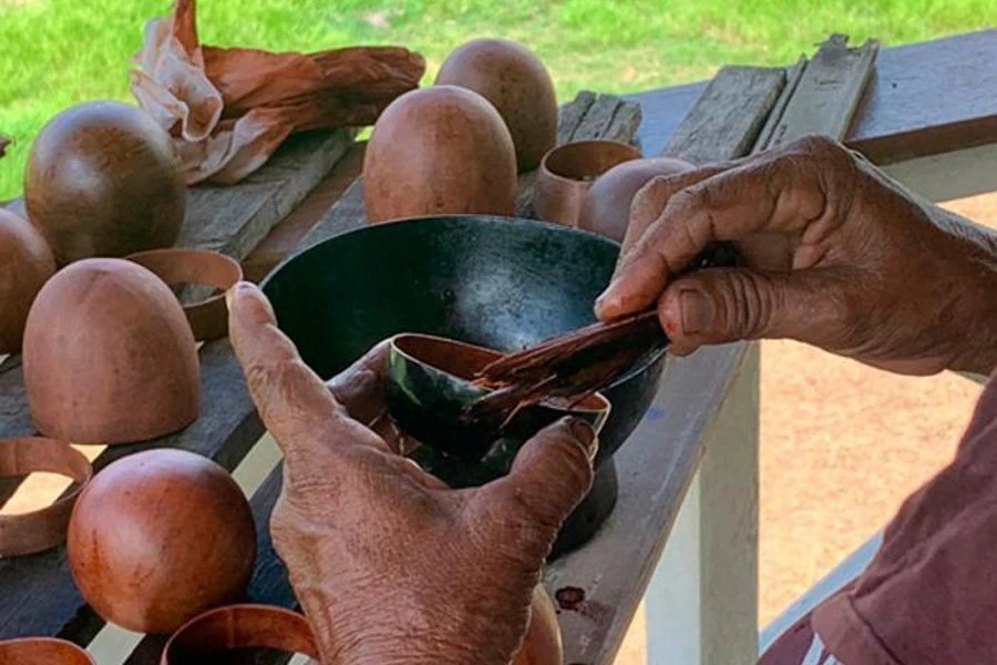 Затем плоды разрезают мачете или пилой, и полученные тыквы помещают в большую кастрюлю с кипящей водой, чтобы размягчить оболочки. Затем внешняя оболочка каждой тыквы осторожно соскабливается лезвием, край сглаживается шершавым языком рыбы пираруку (Arapaima gigas), а внутренняя часть — чешуей той же рыбы. Окончательная подготовка к нанесению лака выполняется путем натирания внутренней и внешней поверхности большими листьями дерева эмбауба (Cecropia), вид которого также встречается в районе, расположенном недалеко от дома семьи. Обработанная, но не покрытая лаком тыква называется «питинга».