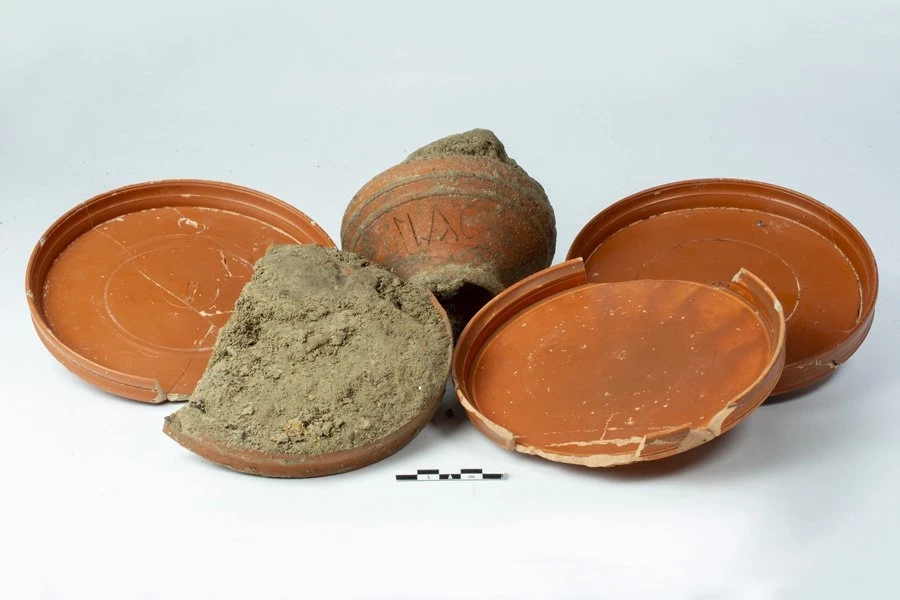 В дополнение к персонализированной чаше археологи обнаружили бронзовый стригиль и подобранный набор из четырех разных тарелок, изготовленных из той же глиняной посуды terra sigilata. Штампы производителей указывают на то, что керамика была изготовлена в Италии около 0 года. Керамика и датировка убедительно свидетельствуют о том, что Флакк был римским солдатом, отправленным в военное поселение на германском лимесе (границе).