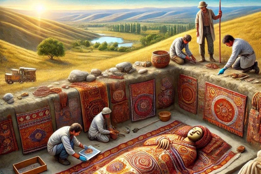 Исключительной находкой стало захоронение знатной женщины в кургане "Четук-4". Археологи обнаружили катакомбу, где покоилась женщина в одеянии с поясом из бронзовых бусин. Пространство могилы было тщательно выбелено и устлано коврами. Рядом с головой усопшей находился четырёхручный сосуд с верёвочным орнаментом. Особое внимание учёных привлекли узоры на полу у ног погребённой, предположительно, остатки геометрического орнамента ковра или узоры, нанесённые охрой.