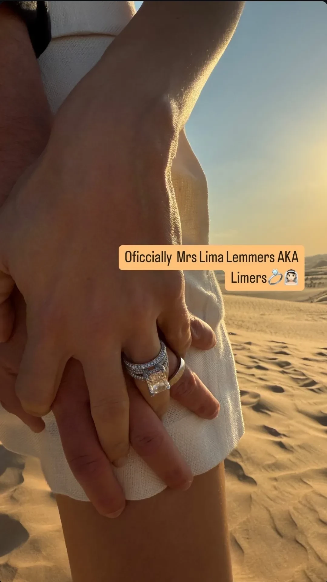 Лима опубликовала в сторис* фотографию, на которой она и 43-летний Андре держатся за руки на фоне пустыни, демонстрируя свои обручальные кольца. Сейчас молодожёны отдыхают в ОАЭ. "Официально миссис Лима Леммерс" — подписала модель фото.