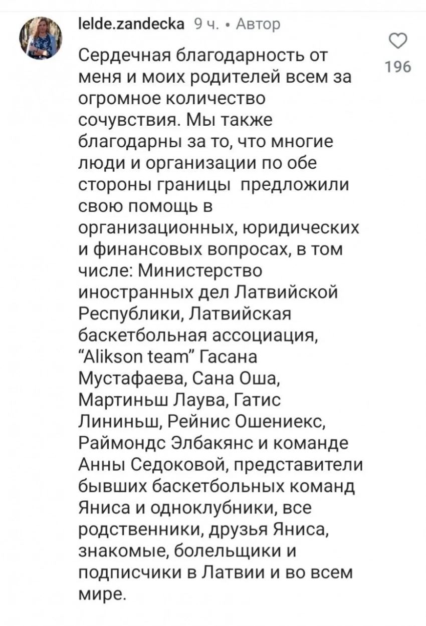 "К сожалению, у матери Яниса нет финансовых средств на похороны. Пожалуйста, поддержите нас в меру своих возможностей, чтобы покрыть расходы на возвращение Яниса домой и похороны в Латвии. Несмотря на его выбор, Яниса всегда будут помнить как тёплого, амбициозного и улыбчивого человека", — написал Лининьш.