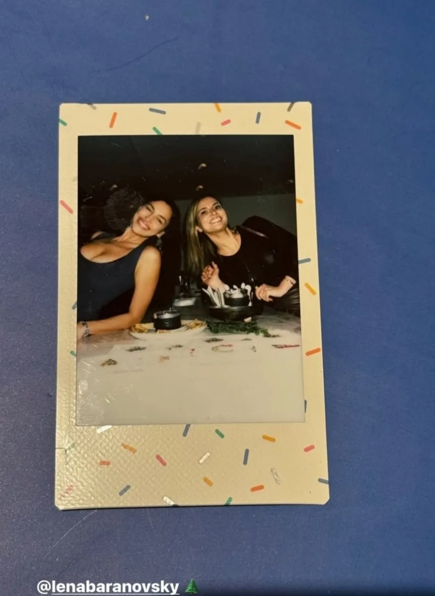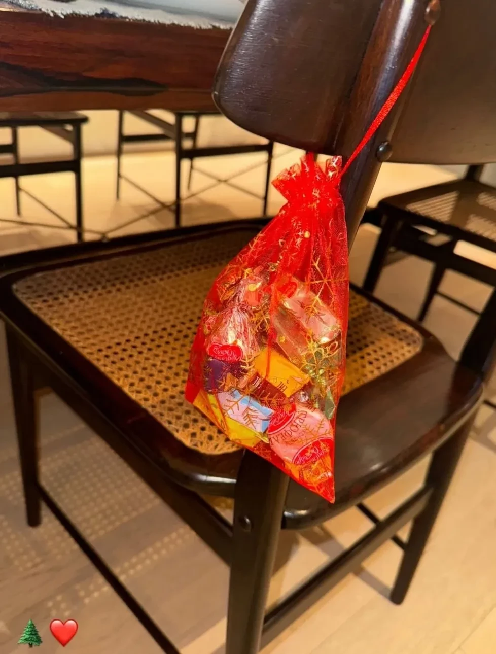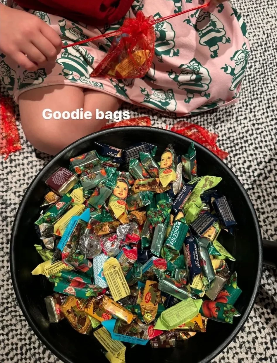 Рождественская вечеринка Ирины Шейк/Фото: личный архивДочь Ирины Шейк Лея/Фото: личный архивСама модель тоже успела сфотографироваться и продемонстрировать подписчикам свой наряд — облегающее тёмно-синее платье. На одном из кадров можно увидеть конфету "Алёнка", "спрятанную" в её внушительном декольте.