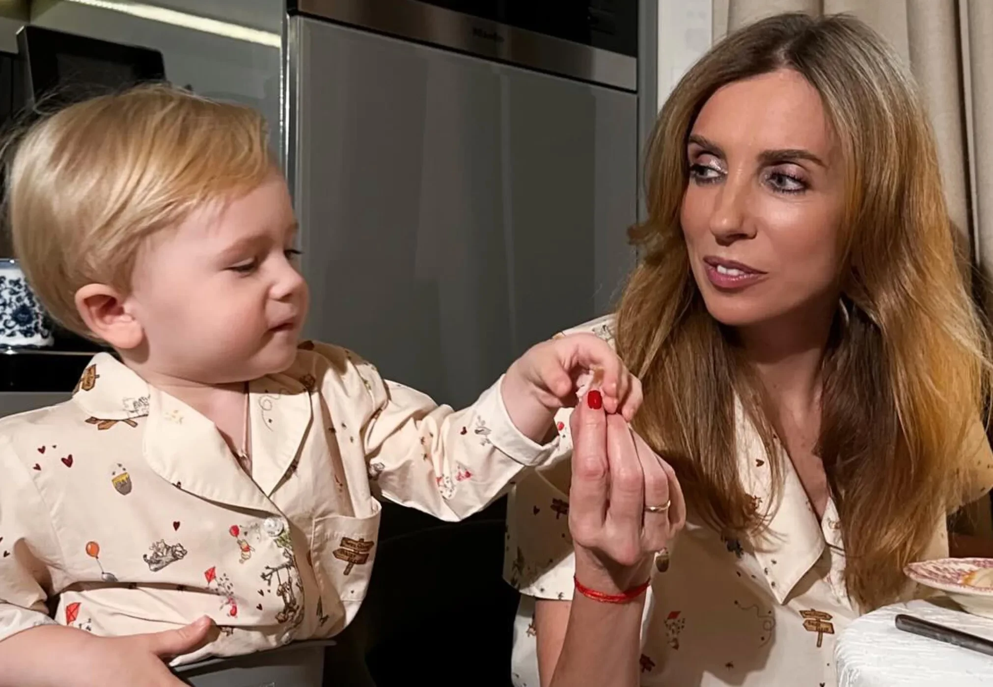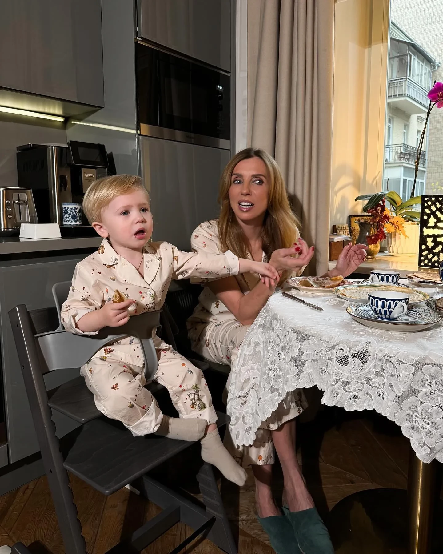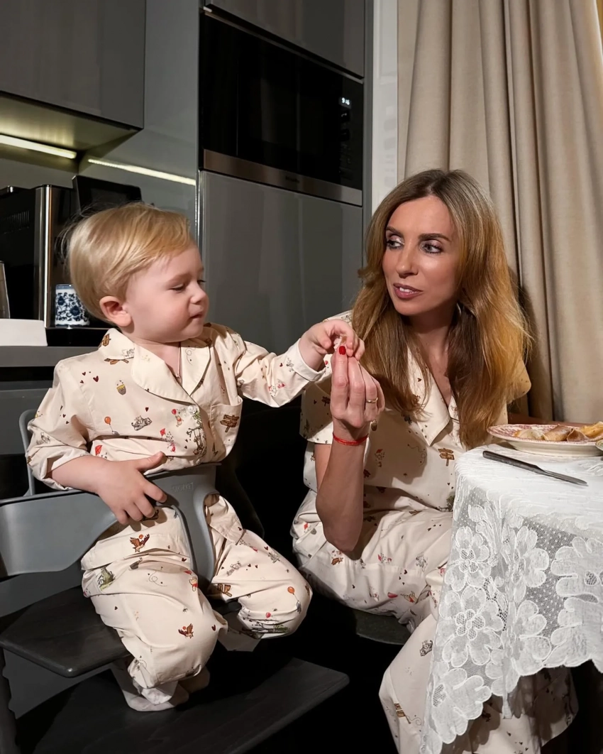 На кадрах 55-летняя Бондарчук позирует вместе со своим сыном за завтраком. Мать и сын одеты в парные пижамы, а Светлана дополнила образ домашними тапочками.