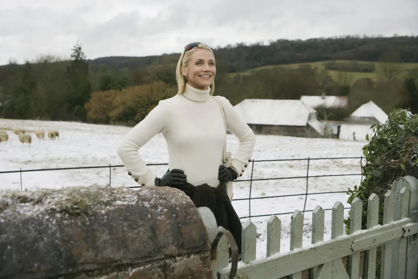 Кэмерон Диас в фильме "Отпуск по обмену" (2006 год)/Фото: кадр из фильма/Columbia PicturesКэмерон Диас в фильме "Отпуск по обмену" (2006 год)/Фото: кадр из фильма/Columbia PicturesГероиня Кэмерон Диас из "Отпуска по обмену" — один из любимых многими "праздничных" персонажей. Успешная владелица рекламного агентства из Лос-Анджелеса носит вещи в стиле "тихой роскоши" и решает изменить свою жизнь, прилетев в отпуск в Англию. Образ Аманды на каблуках и в очках Chanel, в котором она пешком по снегу добирается до коттеджа, стал культовым. Для его создания понадобятся коричневая дублёнка, белая водолазка, массивные очки, которые были актуальны в 2006 году, и кожаные перчатки.Свитер Aim Clo