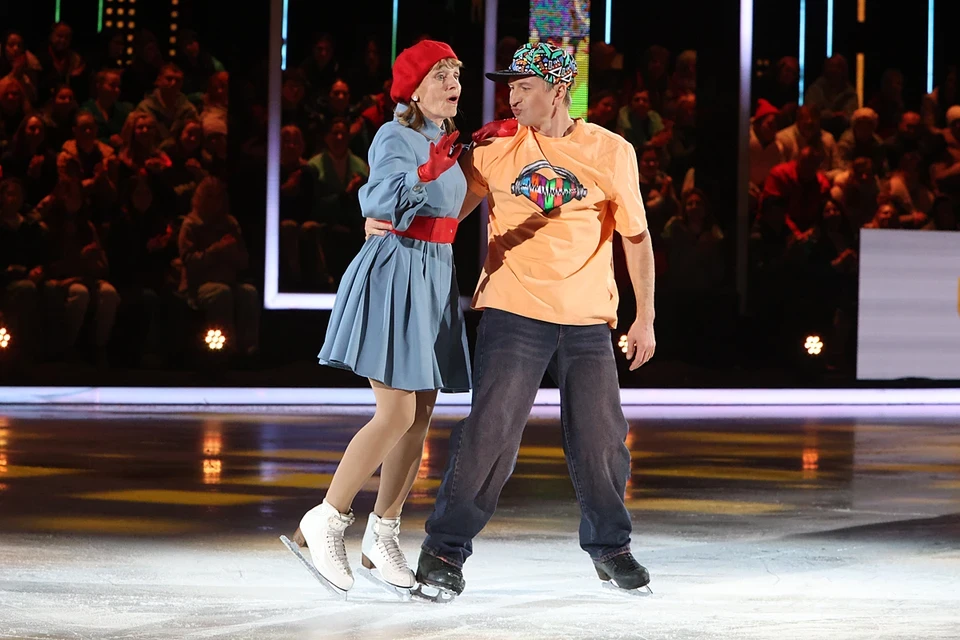 47-летняя любительница Юлия Семина катается в паре с олимпийским чемпионом Максимом Марининым.