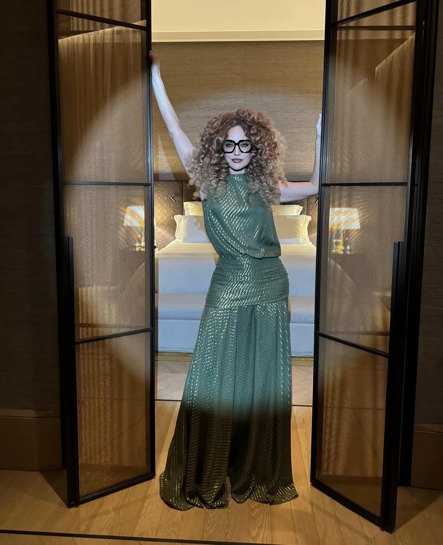 Виктория Шелягова за год сменила несчётное количество образов, но самым запоминающимся стал её выход в блестящем зелёном платье и с кудрявыми волосами.Виктория Шелягова/Фото: vshelyagova/Instagram*