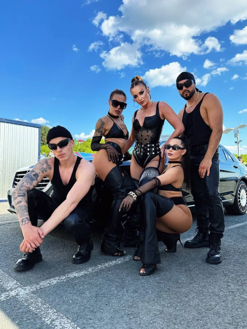 Сложно не отметить и наряд Ольги Бузовой, который она выбрала для выступления в День защиты детей в Уфе. Певица и ведущая вышла на сцену в чёрном кожаном боди, после чего ей пришлось извиняться, а власти задумались о введении дресс-кода для артистов.Ольга Бузова/Фото: byzovahouse/TelegramОльга Бузова с командой/Фото: byzovahouse/Telegram
