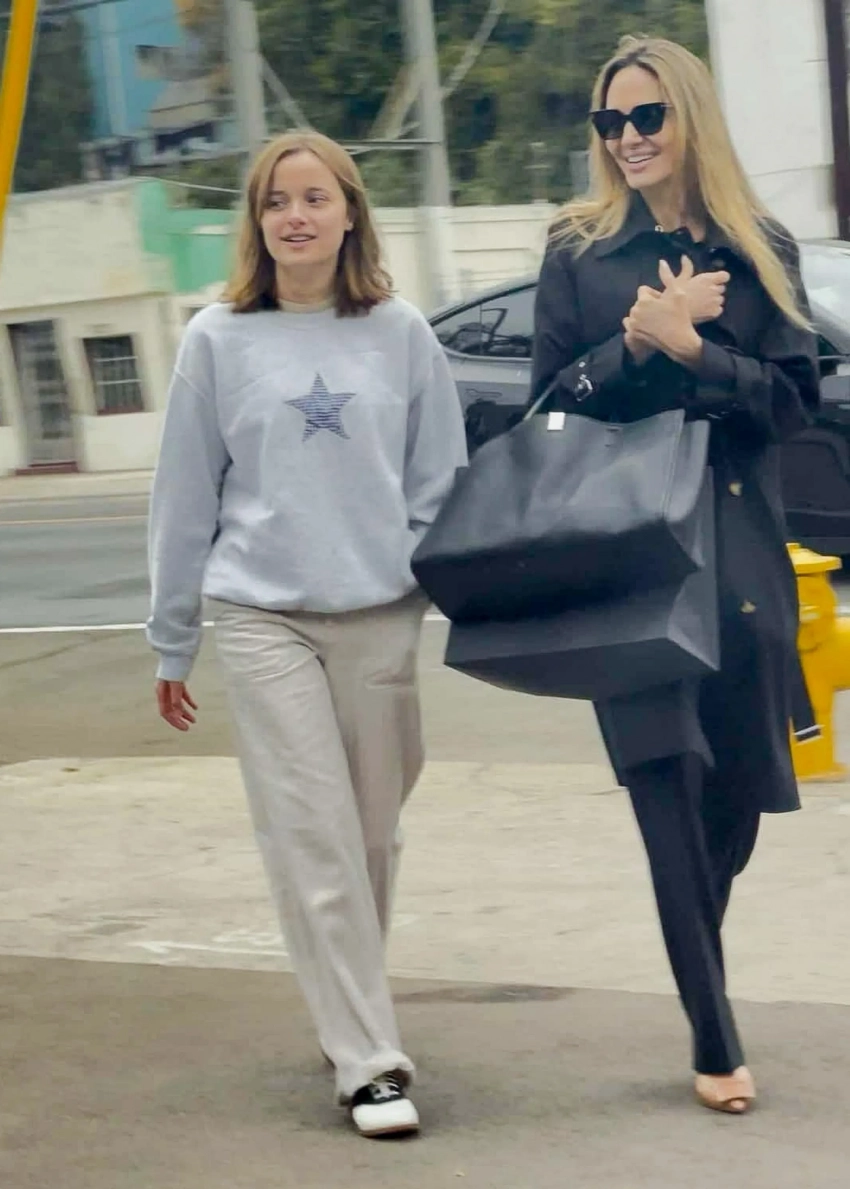 Анджелина Джоли попала в объективы папарацци во время шопинга с 16-летней дочерью Вивьен в Лос-Анджелесе. 49-летняя звезда "Марии" улыбалась фотографам и была одета в чёрный тренч и брюки. В руках она держала объёмную сумку и пакеты с покупками. Вивьен выбрала расслабленный лук: серую толстовку, джинсы и кеды.