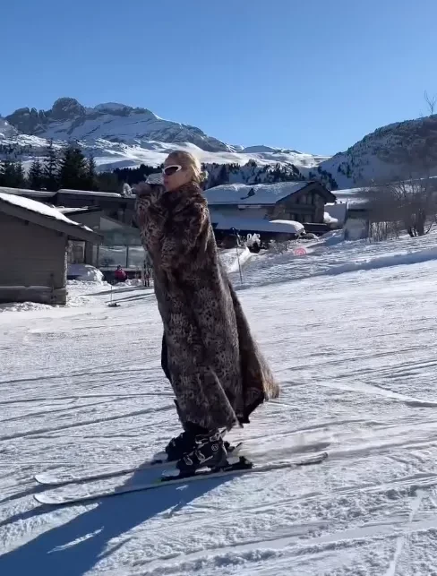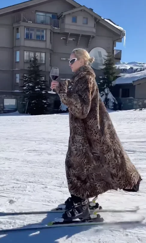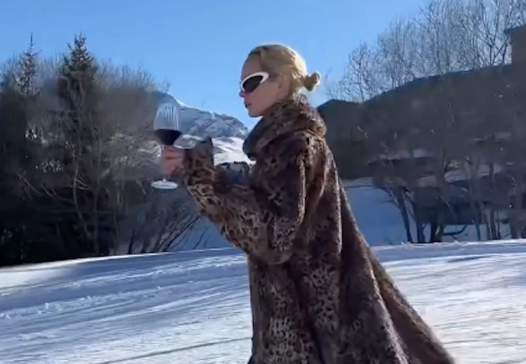 Ольга Карпуть в леопардовой шубе Balenciaga и с бокалом прокатилась на лыжах в Куршевеле