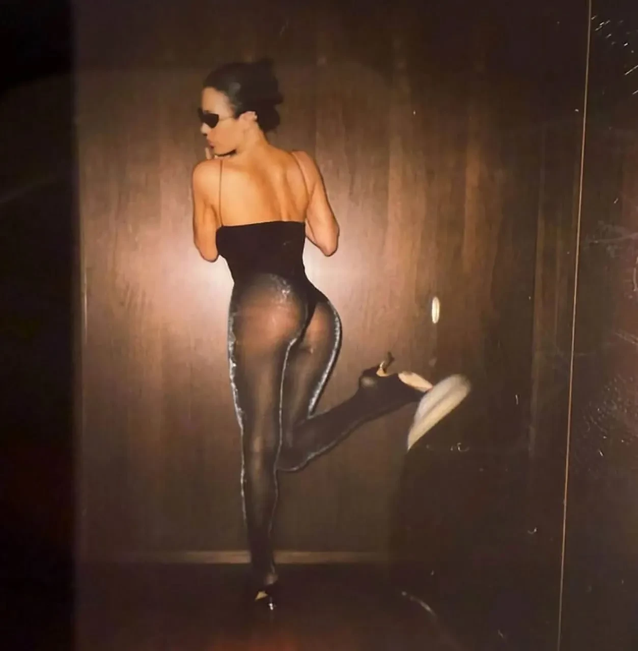 На одном из снимков Бьянка, одетая в сетчатое боди и чёрные сапоги, позирует, наклонившись и стоя спиной к зеркалу. На другом она стоит спиной к камере, при этом на ней уже чёрное боди, блестящие колготки и туфли на высоком каблуке.