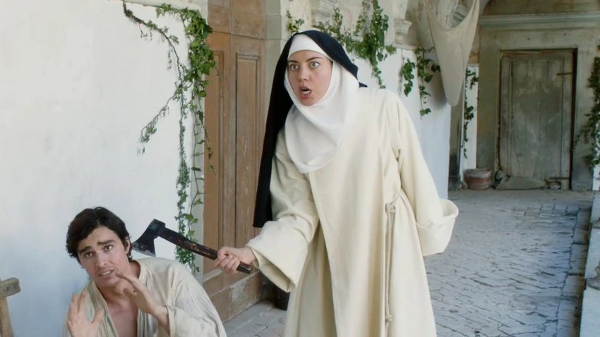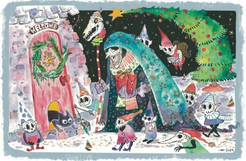 Обри Плаза в фильме "Малые часы"/Фото: StarStream MediaНовогодняя открытка Обри Плазы/Фото: личный архивОдну из монахинь в фильме тоже сыграла жена режиссёра, Обри Плаза. В карьере актрисы много ролей, создавших ей мрачный и немного потусторонний образ, отчасти из-за этого вокруг смерти Джеффа Баэны и начали появляться конспирологические теории. Но дело не только в ролях. Увлечение Обри тёмными силами проявляется и в обычной жизни. Например, с Новым годом она поздравила поклонников очень пугающей открыткой, а однажды, получая награду, во всеуслышание поблагодарила за это дьявола и "всех тёмных лордов". Тогда это было воспринято как шутка, но теперь многие смотрят на сказанное Обри уже иначе.