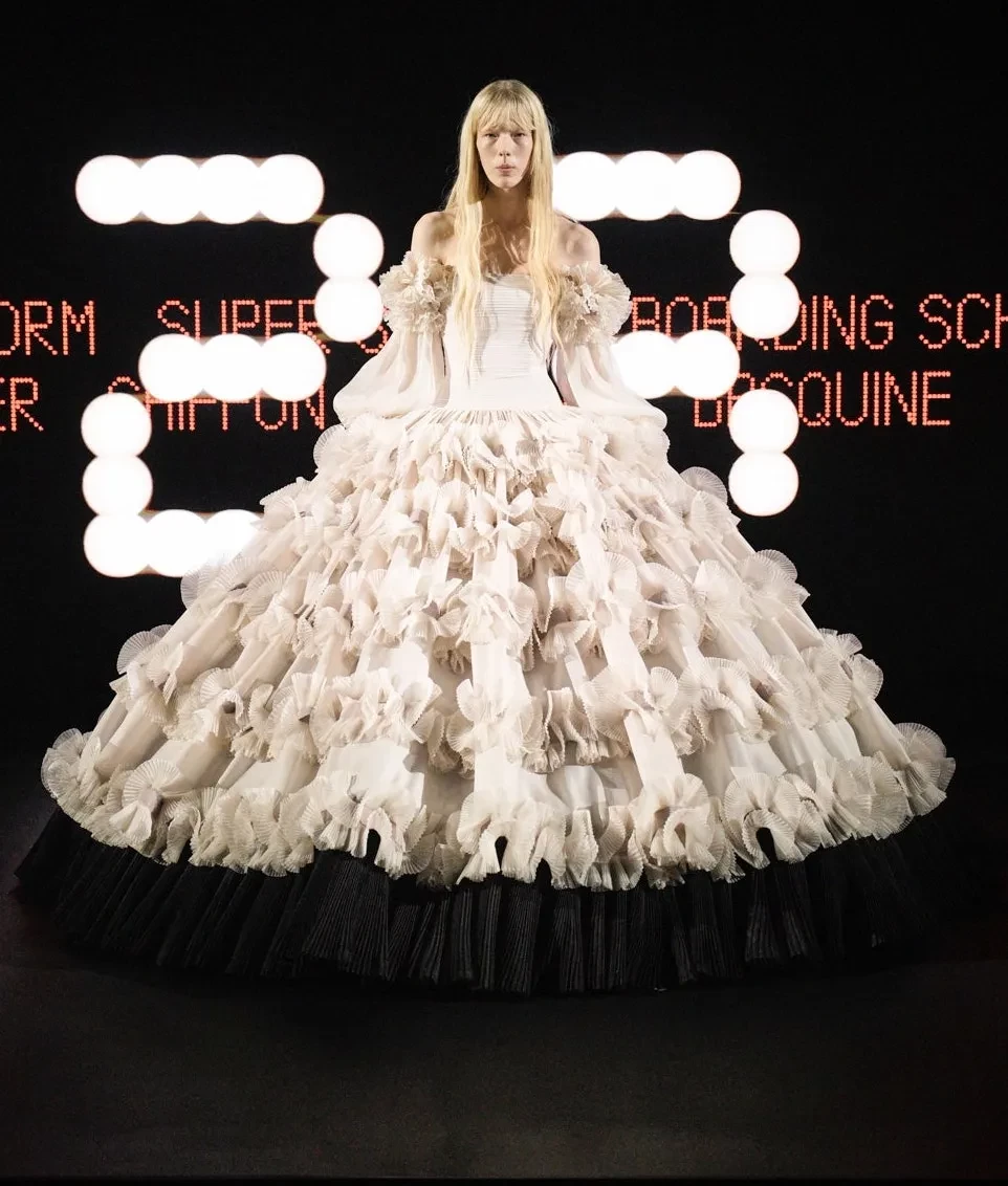 Лу Дуайон/Фото: oxana_bondarenko/Instagram*Новый креативный директор Valentino Алессандро Микеле представил 48 кутюрных луков. Модели выходили на подиум и останавливались в одной точке, чтобы зрители успевали рассмотреть детали. Дизайнер вдохновлялся архивами Valentino, но и, конечно, привнёс свой фирменный почерк: обилие рюшей, цветочная тематика и любимая Алессандро эстетика барокко.