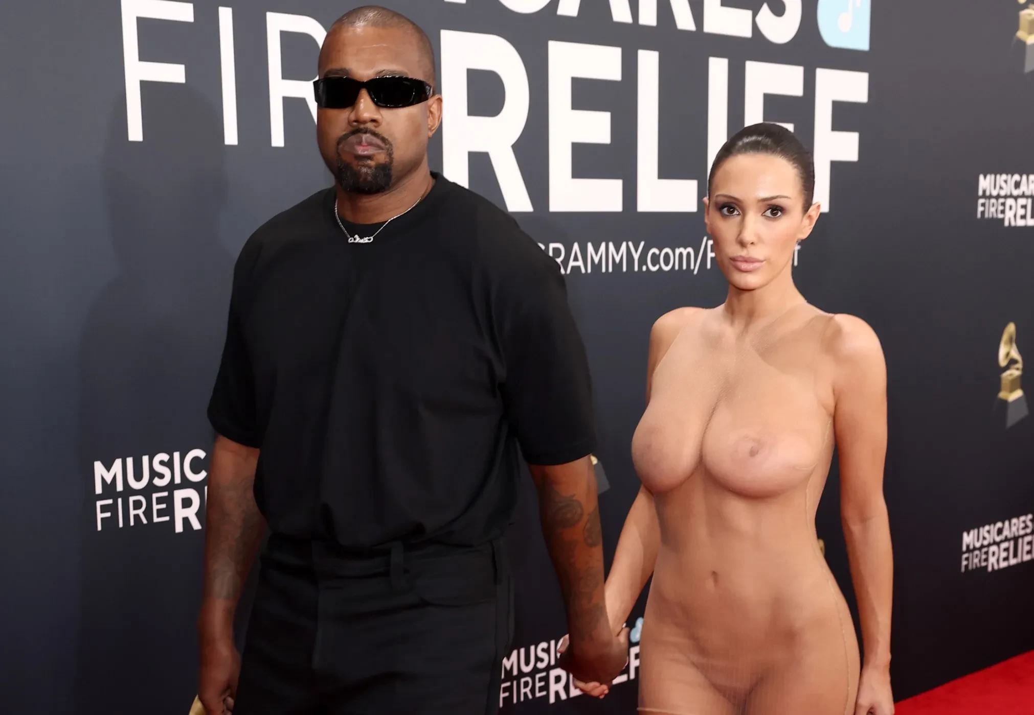 Канье Уэста и его жену Бьянку Цензори выгнали с церемонии вручения премии "Грэмми". Пара вышла на красную дорожку и позировала фотографам. Сначала Бьянка появилась на дорожке в коричневой шубе, которую затем сняла и осталась в полностью прозрачном коротком платье, которое надела на голое тело без нижнего белья.