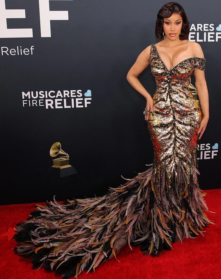 Певица Карди Би не стала эпатировать публику и выбрала платье по всем канонам красных ковровых дорожек — приталенное, с декольте, с перьями и пайетками. Плюс прическа в стиле ретро.