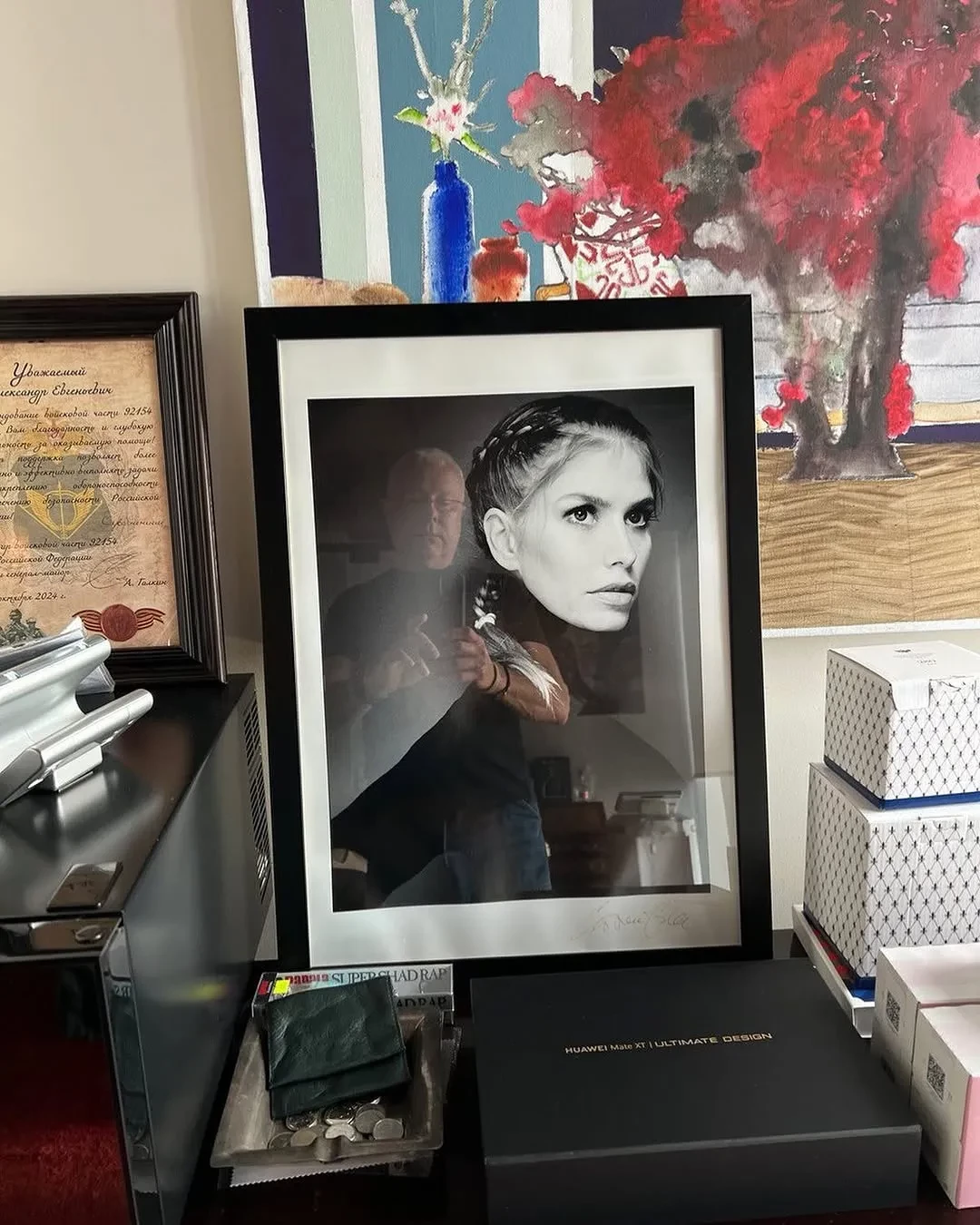 "Фото как стояло, так и стоит в моём кабинете. А слухи, сплетни и пророчества — это пустое дело", — подписал Александр кадр с чёрно-белым портретом Елены.