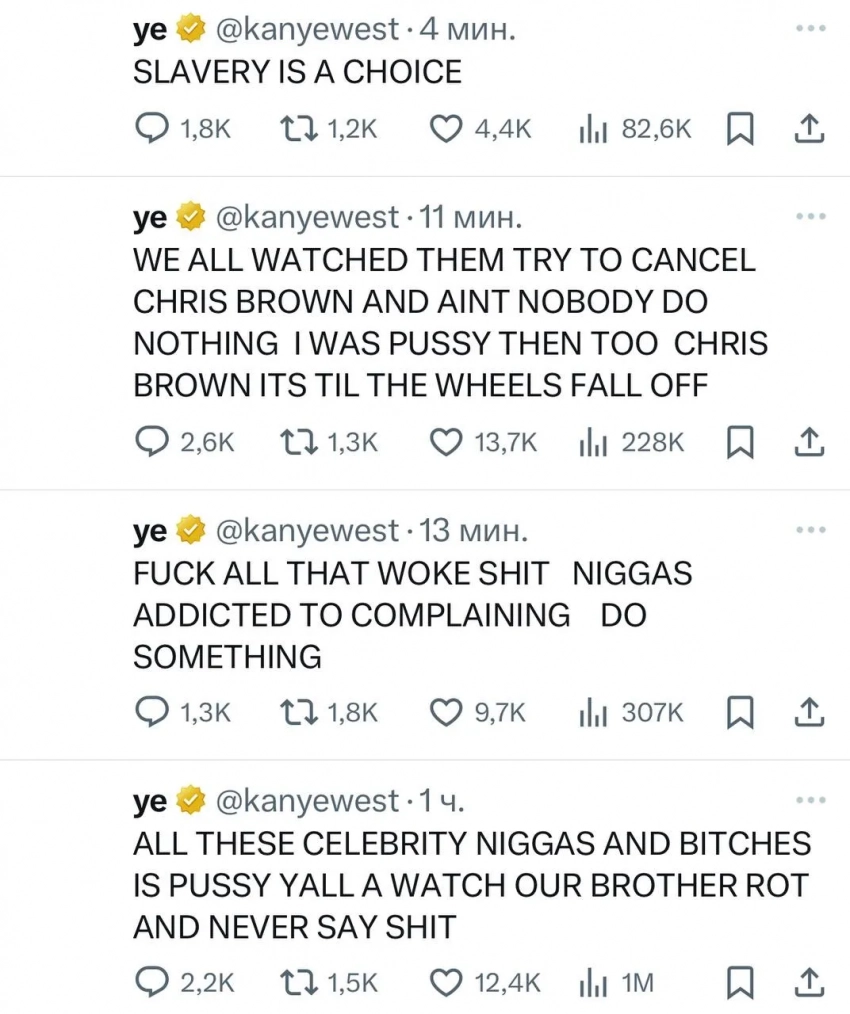 Пост из инстаграма* Канье УэстаПо словам Канье, Пи Дидди намеренно пытаются "отменить", как ранее — Криса Брауна (его также обвиняли в изнасилованиях и физическом насилии). "Мы все смотрели, как забирают Криса Брауна, и никто ничего не делал". Он также отметил, что "рабство — это выбор", и представил футболки с настоящим именем Пи Дидди — Шон Комбс. По словам Канье, коллаборация якобы планировалась ещё до того, как Пи Дидди посадили.