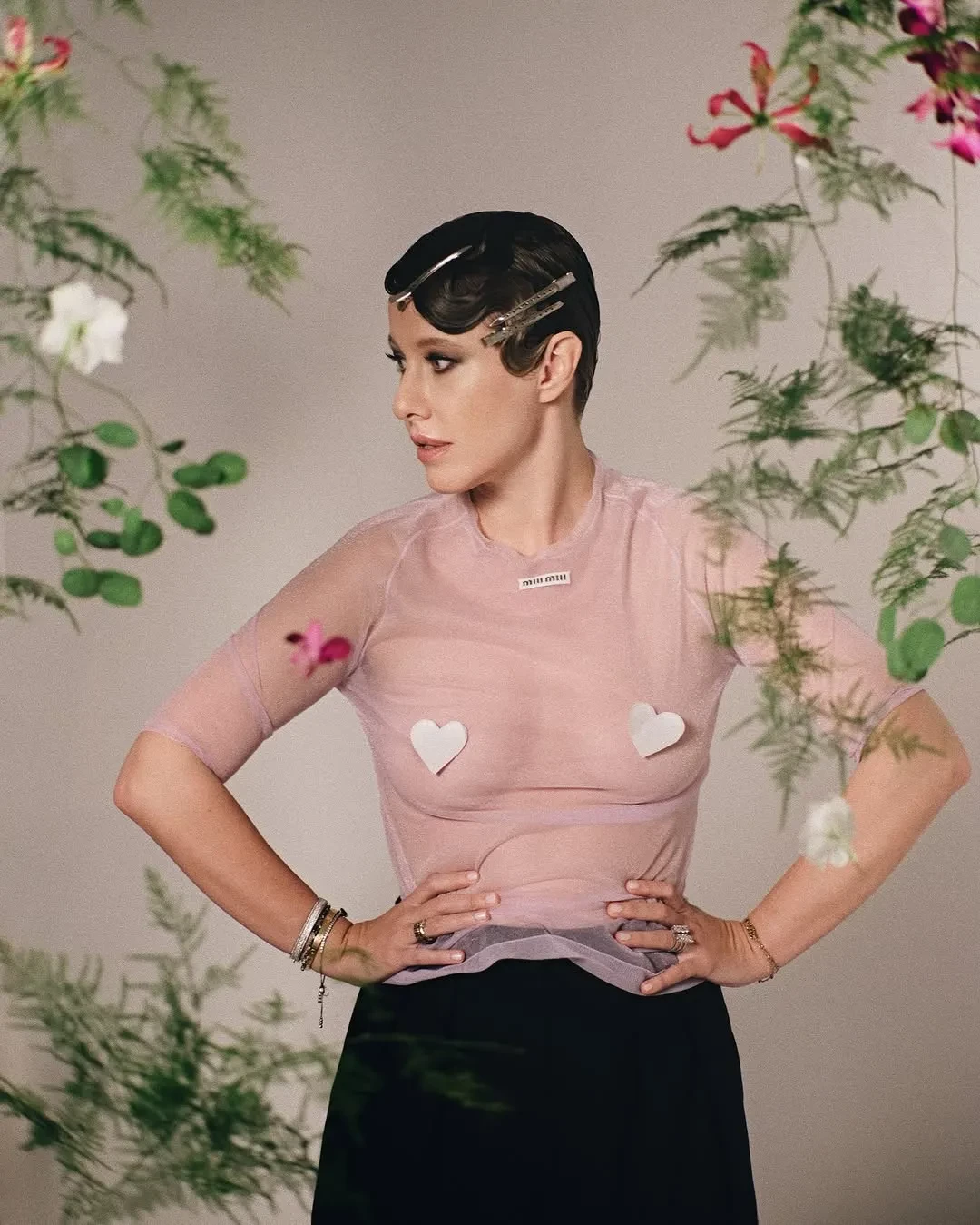 "В День влюблённых надо чем-то порадовать подписчиков. Короче, чем богаты, тем и рады", — подписала 43-летняя Собчак кадры, на которых стоит в прозрачном топе Miu Miu с приклеенными в области сосков стикерами в виде сердец.