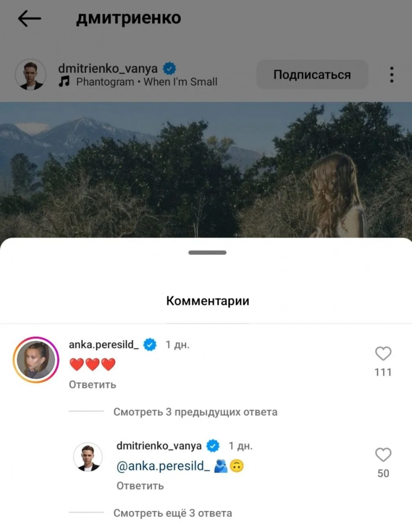 19-летний Дмитриенко опубликовал в инстаграме* подборку фото, среди которых был снимок с 15-летней Пересильд, сделанный, очевидно, во время записи его клипа. "Я люблю тебя, жизнь", — написал он в посте. Пересильд оставила под постом эмодзи в виде сердец, на что Иван отреагировал эмодзи в виде объятий.