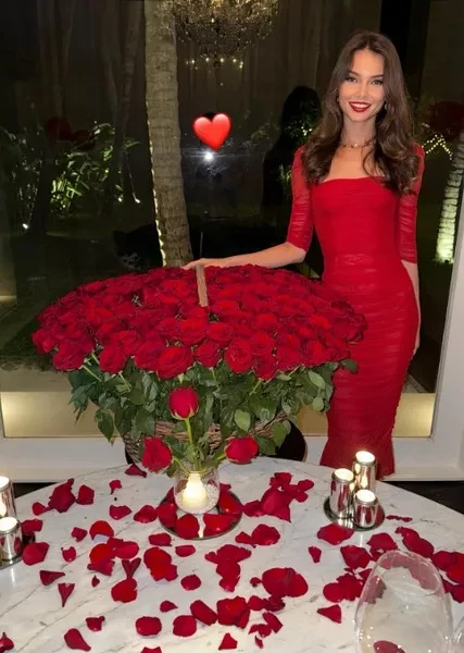 На одном из снимков Юлия стоит в красном платье в ресторане, а на столе рядом с ней — большой букет роз. Также Полячихина добавила несколько кадров, где она позирует в одном полотенце перед бассейном с лепестками роз.