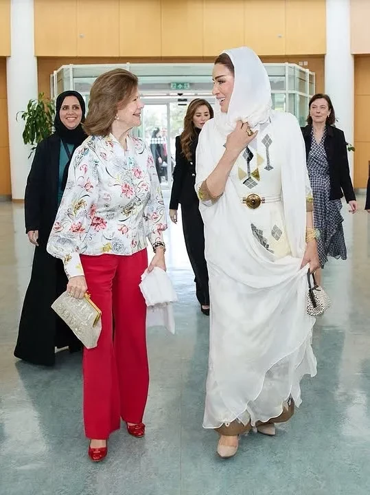 Королева и первая модница Востока, как окрестили Мозу в прессе, посетила мероприятия в рамках программы социального предпринимательства. Шейха встретила гостью в кутюрном наряде Valentino, расшитом золотыми цветами, а королева выбрала розовое платье Georg et Arend. В другой день Моза оделась в белое, а Сильвия выбрала красные брюки Salvatore Ferragamo и блузу Thalia с цветочным принтом.