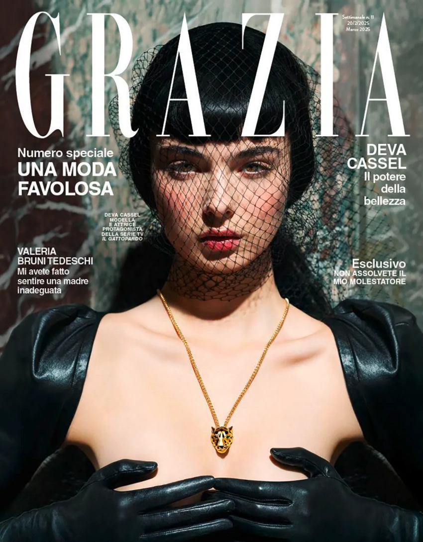 Дева Кассель украсила обложку нового номера итальянской версии журнала Grazia. На снимке 20-летняя дочь Моники Беллуччи и Венсана Касселя позирует в кожаном наряде Dior с вуалью на голове и золотым украшением ювелирного дома Cartier.