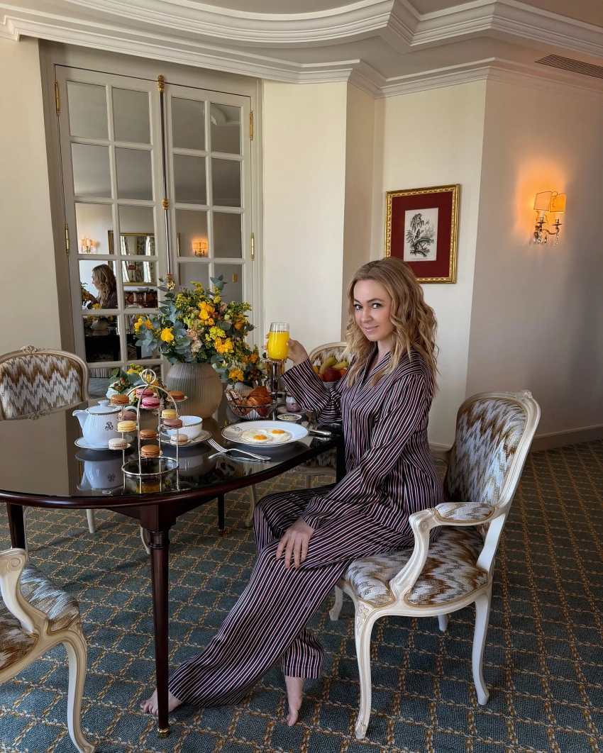 Яна Рудковская/Фото: rudkovskayaofficial/Instagram*Яна Рудковская/Фото: rudkovskayaofficial/Instagram*Яна Рудковская/Фото: rudkovskayaofficial/Instagram*Яна Рудковская/Фото: rudkovskayaofficial/Instagram*Яна Рудковская/Фото: rudkovskayaofficial/Instagram*Также продюсер опубликовала несколько снимков из своего отеля Bristol: из холла, а также из номера, где она завтракает в полосатой пижаме. Рудковская рассказала, что сейчас живёт в номере, где снимали сцены из фильма Вуди Аллена "Полночь в Париже". "Аллен всегда тут останавливается и часто додумывает свои фильмы по ходу съёмок", — подписала Рудковская фотографии. Её муж, 42-летний фигурист Евгений Плющенко, не поехал с ней в Париж, сейчас он ставит новое ледовое шоу.