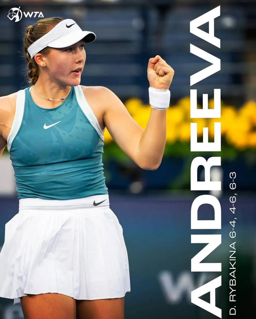 Мирра Андреева выиграла у казахстанской спортсменки Рыбакиной со счётом 6:4, 4:6, 6:3 и впервые в своей карьере вышла в финал турнира WTA 1000. Выступление на соревнованиях в ОАЭ позволит Андрее обойти в мировом рейтинге свою соотечественницу Дарью Касаткину, которая сейчас занимает более высокое место среди остальных россиянок — 11 строчку. Стоит отметить, что перед началом турнира Андреева располагалась на 14 позиции.