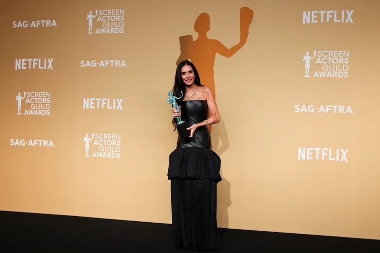 Деми Мур тоже не ушла без награды: 62-летняя актриса получила статуэтку за главную женскую роль в фильме «Субстанция». На дорожке стройная как лань Деми появилась в готическом платье с кожаным корсетом от Bottega Veneta и выглядела роскошно.