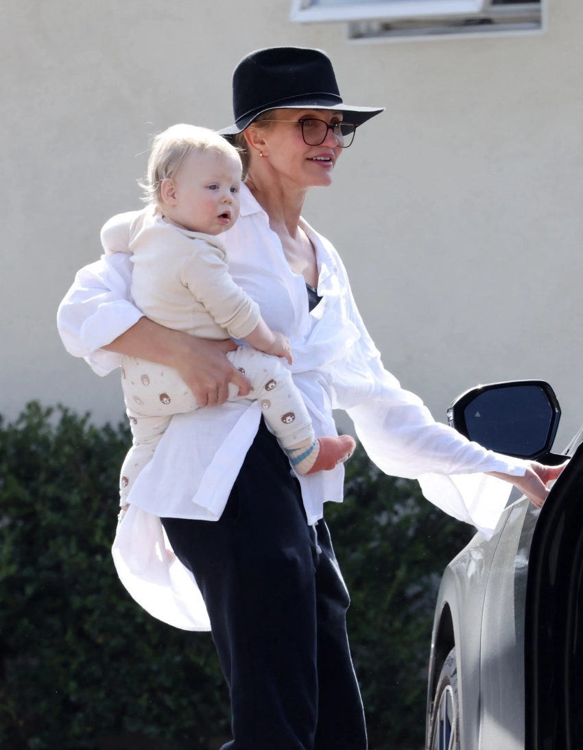 Кэмерон Диас заметили на публике с годовалым сыном Кардиналом от музыканта Бенджи Мэддена. Папарацци застали 52-летнюю актрису с ребёнком на парковке.