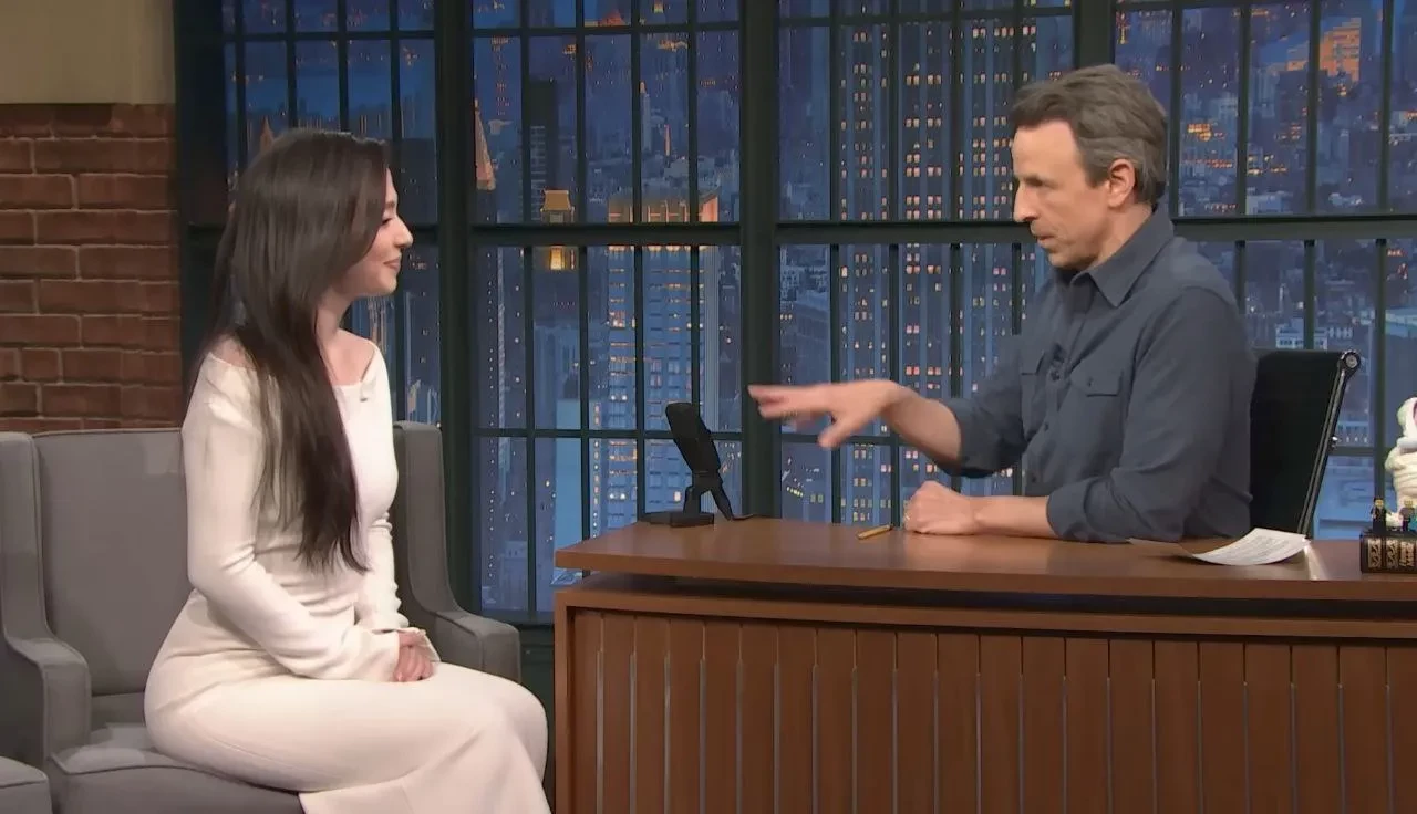Майки Мэдисон на шоу/Фото: кадр из видео/Late Night with Seth MeyersПо словам Майки, со своими партнёрами по съёмочной площадке она пару раз выезжала на природу на выходные. Во время одной из таких вылазок они "просто гуляли по лесу, шёл снег, и это было потрясающе". В какой-то момент от Юры и Марка поступило предложение. "Они сказали: "Завтра праздник, и мы должны его отметить". Утром они приготовили блины, и мы их ели. Я подумала: "Какой чудесный праздник". А потом Юра, который играл у нас роль весельчака, такой: "А теперь нам надо пойти в лес и сделать человека из дерева, чтобы потом его сжечь", — смеясь, рассказала Майки, показывая ведущему мимикой и жестами, что была в недоумении от такой идеи.