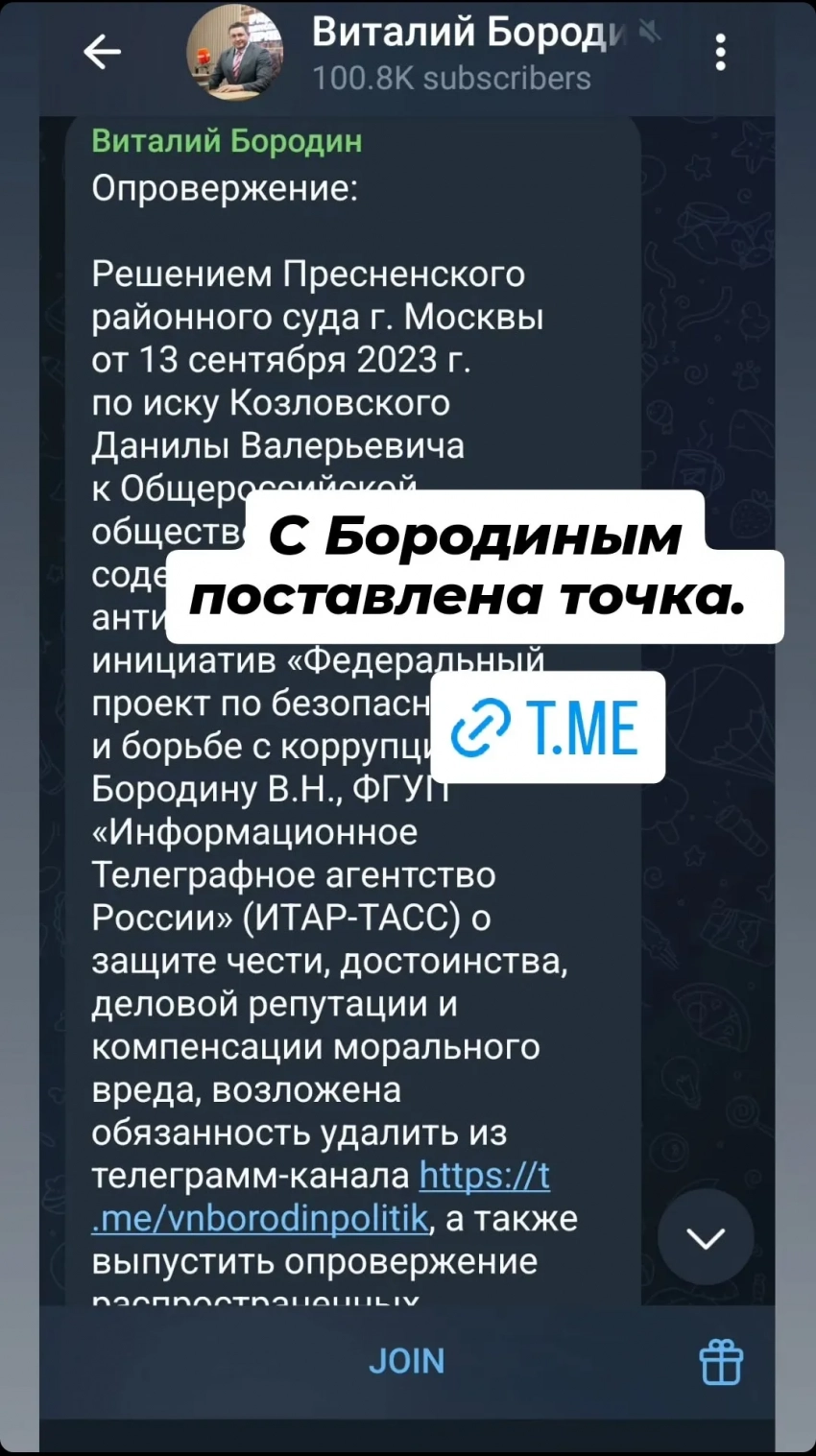 "С Бородиным поставлена точка. Мне было важно защитить репутацию от этого бреда, потому что я живу в Москве, я никуда не "убегал", я дома и я никогда не переставал любить свой дом", — написал Козловский в своём инстаграме*.