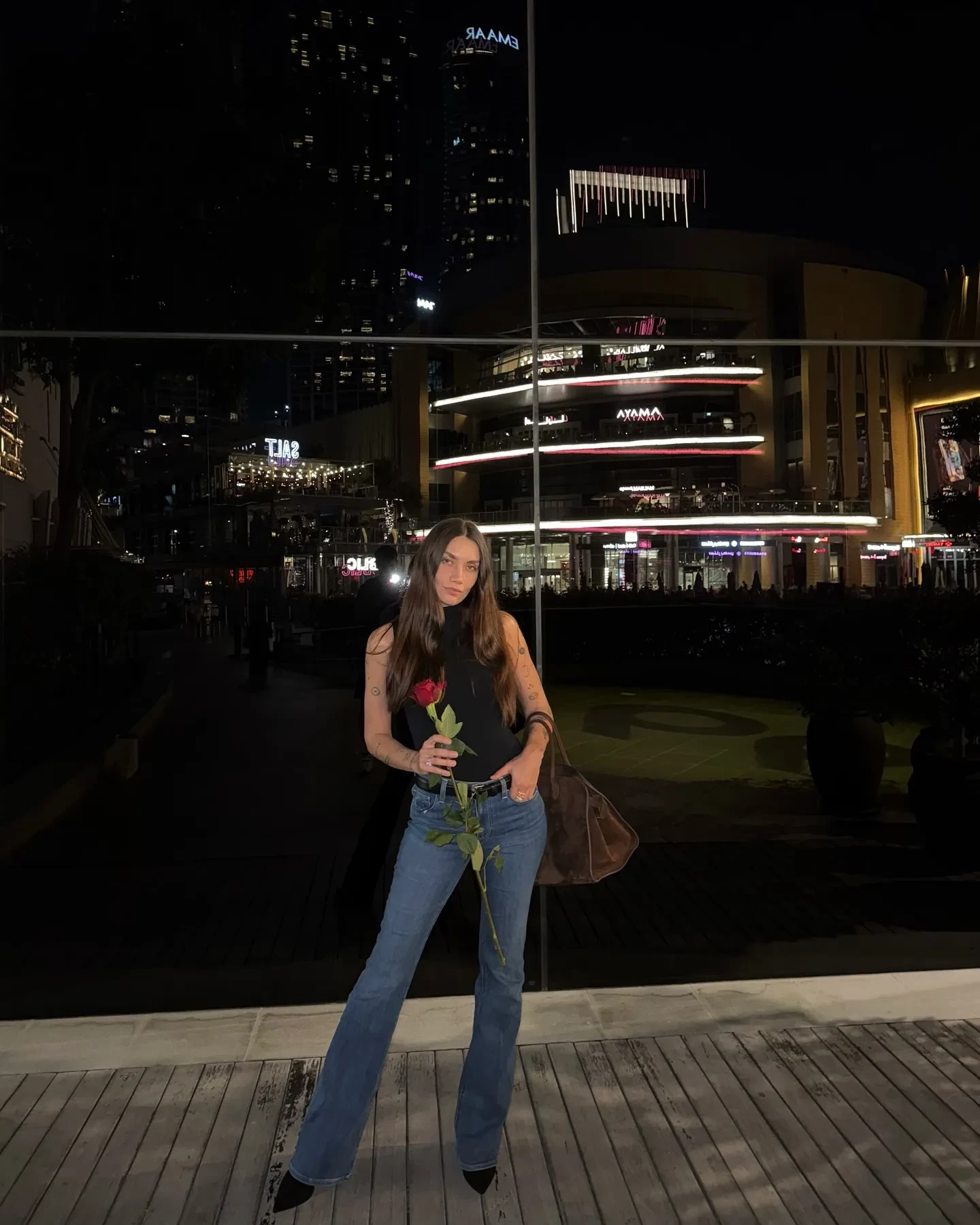 На снимках Истомина позирует на фоне высоток, на вечерней улице с розой, в ресторане с едой, а также у моря с дочерью на руках.