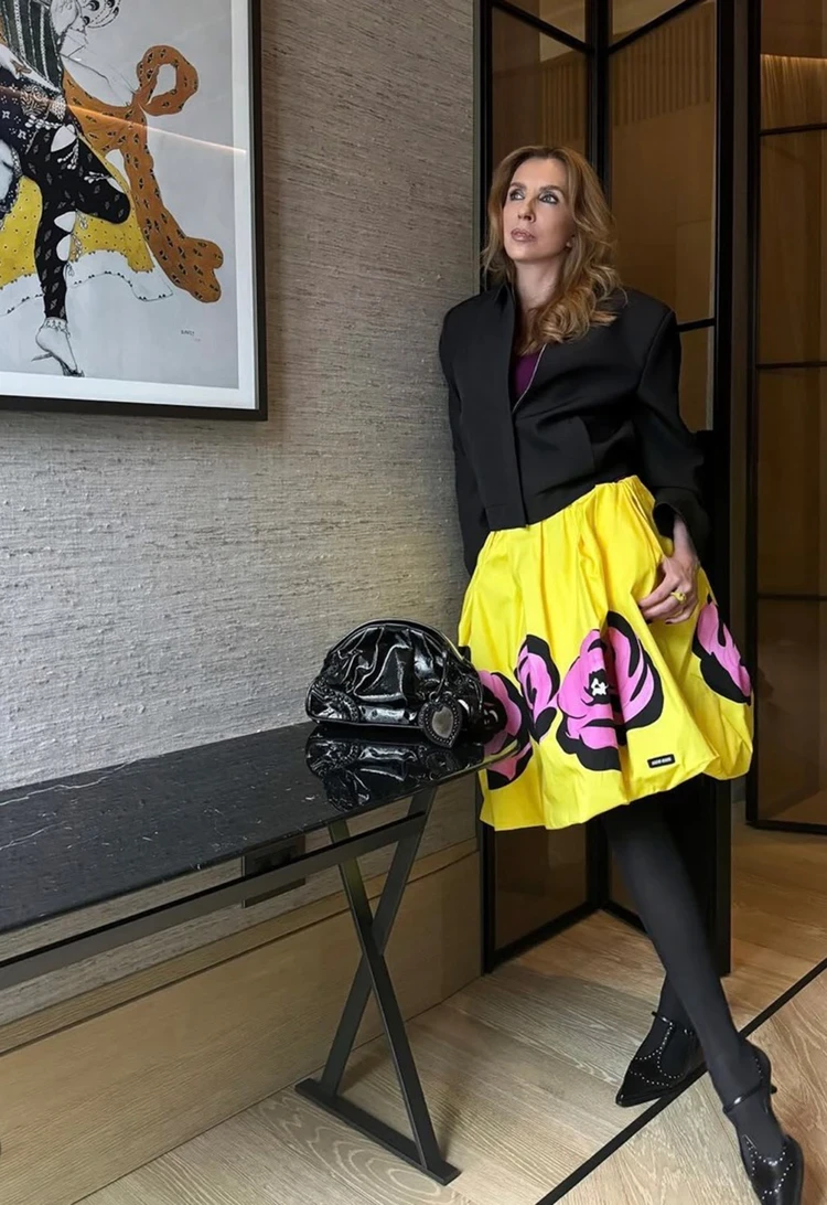 Кажется, что Светлана может обыграть абсолютно любой предмет гардероба — даже желтую юбку-баллон, которая подойдет единицам. Кстати, юбка от любимого бренда всех модников Miu Miu — архивная, то есть уникальная и из прошлого. Яркую вещь с цветами Бондарчук сбалансировала с помощью темного «верха» — черного жакета на молнии, а также дополнила черными колготками и оригинальными слингбэками. Кстати, сливовую футболку и желтое кольцо, которое можно заметить на руке Светланы, она подобрала в тон юбки.