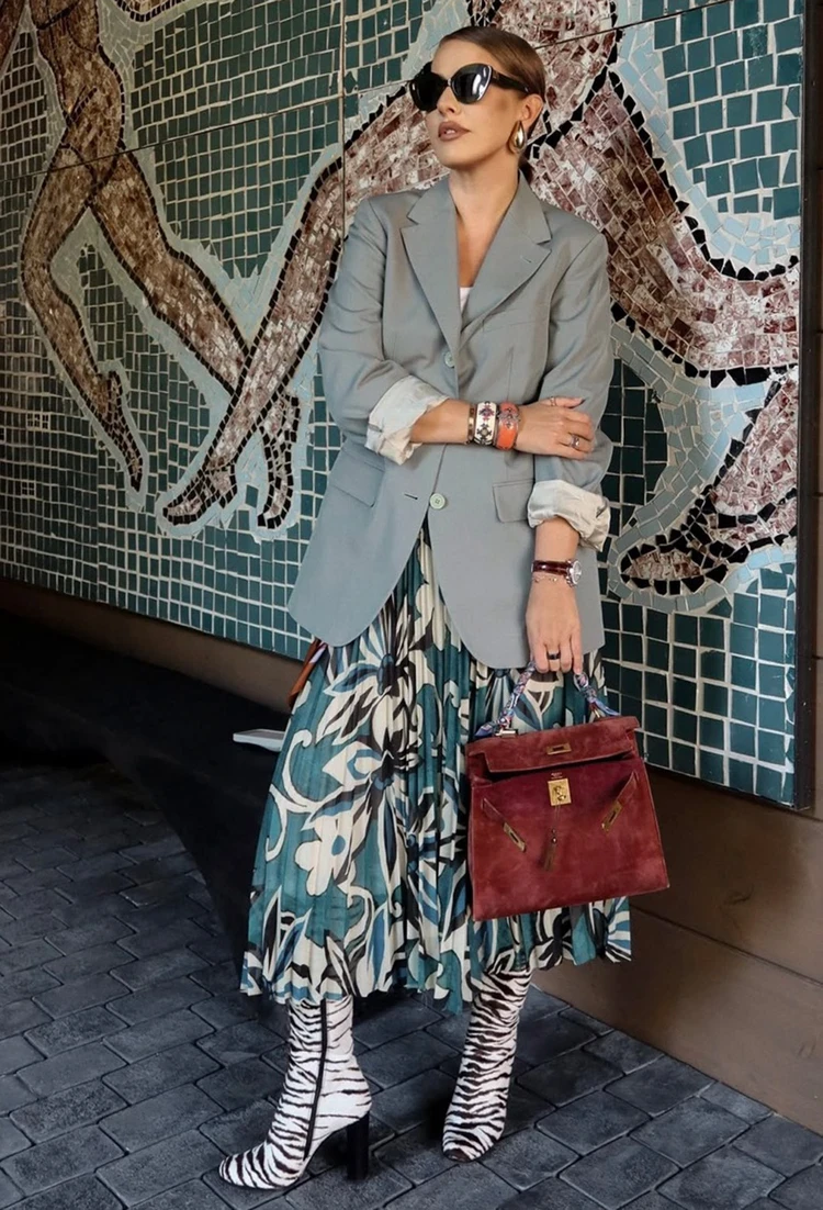 Любительница сложных модных решений Ксения Собчак в одном образе смешала сразу два принта — цветочный и анималистичный, что нужно делать крайне осторожно. Юбку оттенка морской волны с цветами звезда сочетала с оригинальными сапогами с принтом зебры и серым жакетом. Мне очень нравится, как в этот лук вписались крупные этнические браслеты и коричневая сумка Hermes. Лук получился интересным.