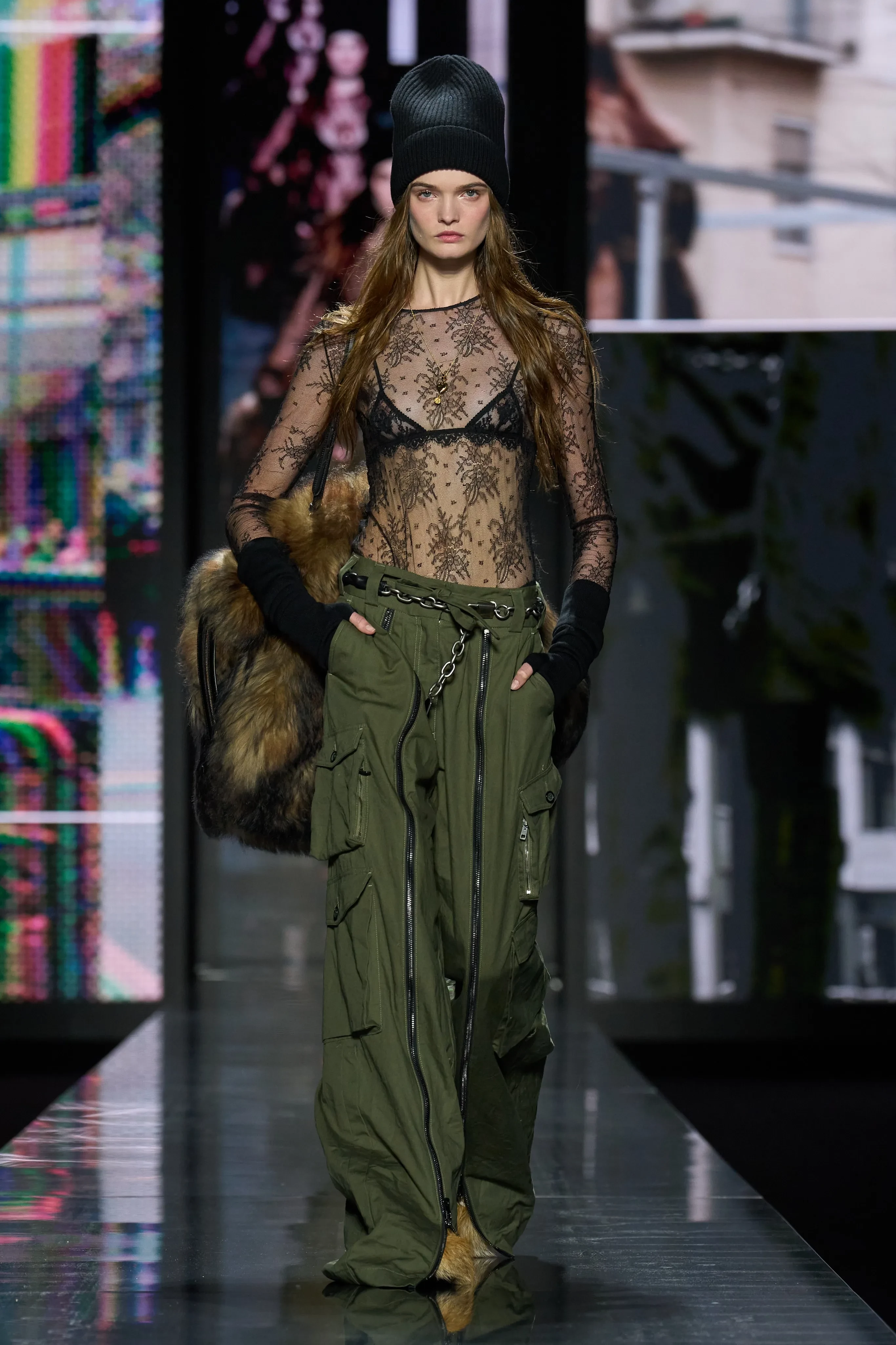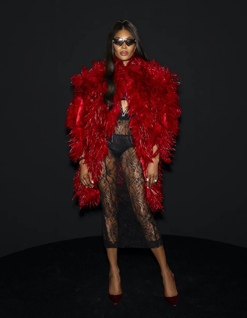 Фай Хадра/Фото: Dolce & GabbanaОснователи бренда Доменико Дольче и Стефано Габбана устроили показ прямо на улицах Милана, который закончился вечеринкой под открытым небом, где с диджей-сетом выступила участница Måneskin Виктория Де Анджелис. Ирина Шейк, Амелия Грей и другие топ-модели начинали дефилировать на улице и продолжали в здании, а на финальном проходе они вернулись на улицу и танцевали под музыку под восторженные аплодисменты прохожих. В своей осенней коллекции бренд Dolce & Gabbana представили вещи, идеально подходящие для вечеринок до утра: кожаные плащи, шубы, короткие шорты, кружевные топы и платья с перьями, высокие сапоги, трикотажные чулки и шапки, чтобы точно не замёрзнуть на open air. Закрыла шоу грузинская модель Матильда Гварлиани в мини-платье, расшитом драгоценностями.