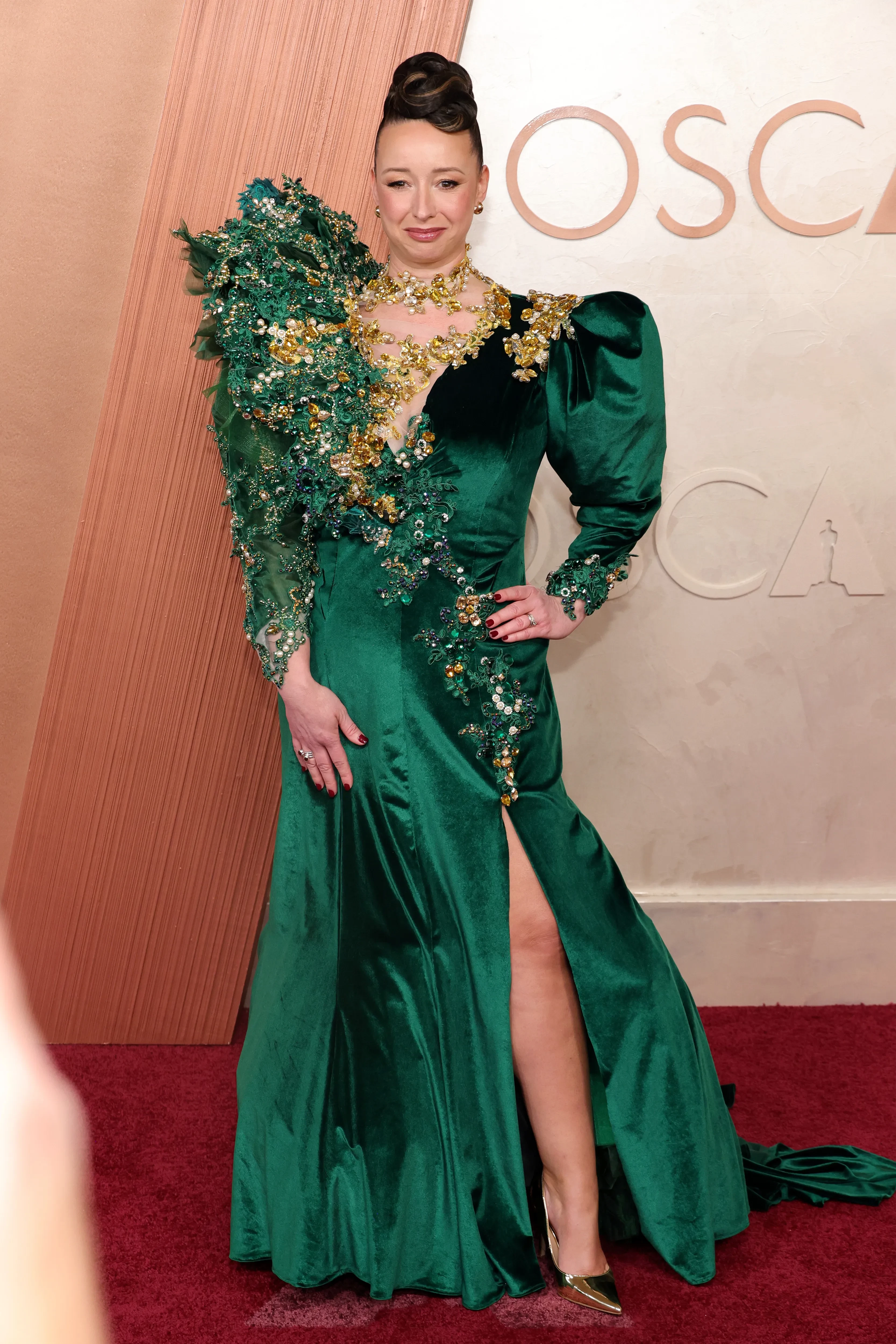 Звезда фильма "Боб Дилан: Никому не известный" Моника Барбаро, возможно, хотела повторить культовый выход Гвинет Пэлтроу на "Оскаре" в 1999 году, но что-то пошло не так. Актриса выбрала розовое платье Dior, но "пушистый" лиф грязно-бежевого оттенка испортил образ. Визажистка Лора Блаунт, которая работала над макияжем актёров в фильме "Злая", впечатлила своим образом на дорожке. Она надела зелёное платье с разрезом и массивным верхом, а на голове соорудила пучок. Так и до Лены Лениной недалеко.