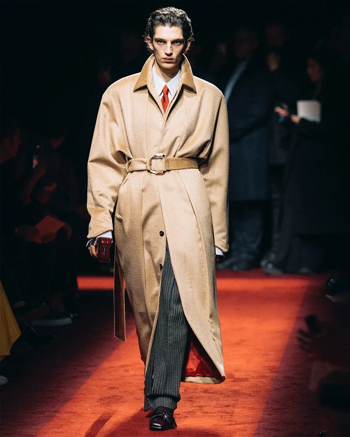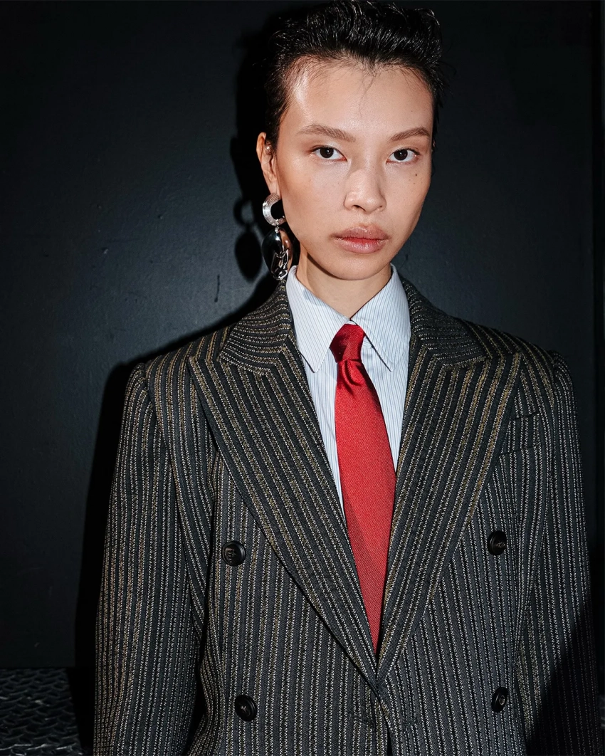 Эд Вествик/Фото: ferraristyle/instagram*Омар Аюсо/Фото: ferraristyle/instagram*Тина Кунаки/Фото: ferraristyle/instagram*Аличе Пагани/Фото: ferraristyle/instagram*Матео Чеккарини и Ева Риккобоно/Фото: ferraristyle/instagram*Элли Туманн/Фото: ferraristyle/instagram*Жан-Карло Леон/Фото: ferraristyle/instagram*Карен Бланчард/Фото: ferraristyle/instagram*Под руководством креативного директора Рокко Янноне бренд представил коллекцию, вдохновлённую динамикой легендарных автомобилей Ferrari. Коллекция открылась с переосмысления делового стиля: серые плиссированные костюмы сочетались с массивными меховыми и верблюжьими пальто и дополнялись галстуками Rosso Corsa. Среди ключевых элементов коллекции — меховые пальто, золотые ткани с бахромой и кожаные аксессуары. Фирменной деталью, возвращающейся из сезона в сезон, стали перчатки — неизменный атрибут поклонников Ferrari.