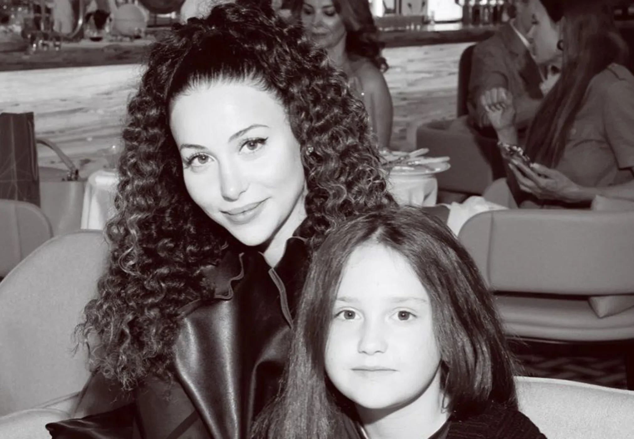 На снимке Зепюр вместе с Мией сидит в ресторане. Обе смотрят в объектив и улыбаются.