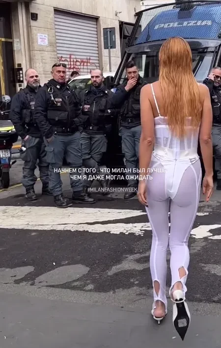 Модель Алеся Кафельникова на Неделе моды участвовала в шоу Blumarine и закрыла показ Iceberg, а стилистка Лина Дембикова впечатлила местную полицию своим появлением в "нижнем белье" на показе Dolce & Gabbana.