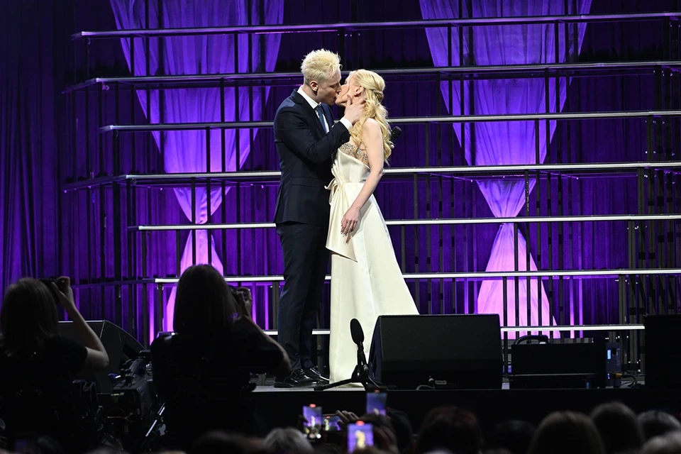 После одной из песен SHAMAN вышел на сцену с букетом белых роз. И пригласил на сцену Екатерину Мизулину - она поднялась в красивом платье. И тогда случилась сенсация.