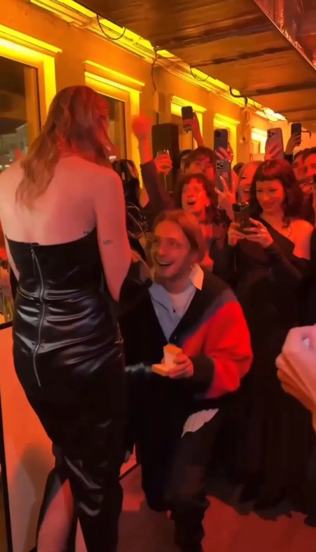 Мария Миногарова и Александр ГорчилинПосле этого Горчилин добавил, что “в этой жизни можно любить до слез”, как в песне Александра Серова. Опустившись на одно колено, он протянул Миногаровой коробочку с обручальным кольцом и добавил: “Маша, что бы ни произошло, я ни в чем не могу быть уверенным, кроме того, что я ощущаю внутри себя, но я тебя люблю. И мой подарок на день рождения — это я. Я хочу сделать тебе предложение быть со мной”. Мария ответила своему молодому человеку согласием и поспешила его поцеловать.