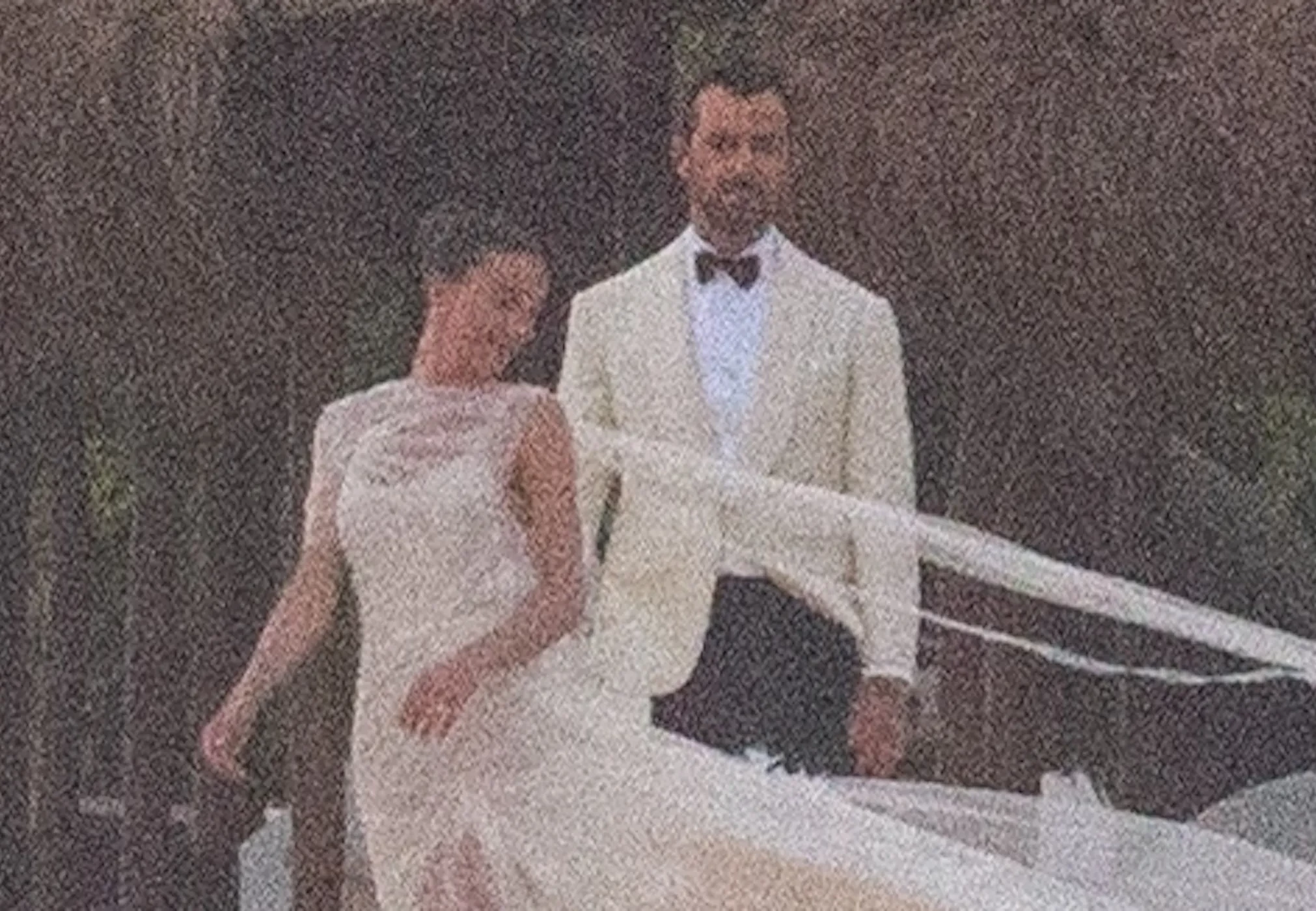Невеста была одета в белое платье с длинным шлейфом и открытой спиной, а жених — в белый смокинг с бабочкой и чёрные брюки. На церемонии присутствовали только самые близкие друзья и родственники, а молодожёны танцевали босиком на песке.