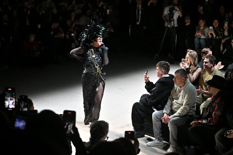 Милявская продемонстрировала блестящее черное платье из пайеток с глубоким разрезом по ноге. Наряд украшала массивная цепь из часов и булавок. Лолите сделали готический макияж. Звезда, чьи концерты массово отменяют в регионах, смотрелась в эксцентричном образе вполне органично.