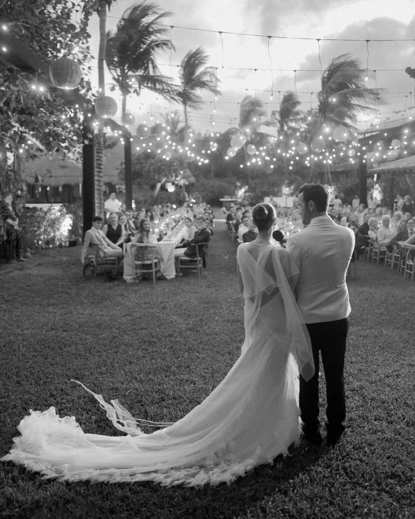 Свадьба прошла в эти выходные на курорте Кспу-Ха в Мексике в отеле Esencia. Пара выбрала это место после того, как они провели там отпуск год назад. Невеста шла к алтарю в платье, созданном на заказ её подругой и дизайнером Викторией Бекхэм, а для ужина переоделась во второй наряд из тюля Danielle Frankel. Образы Николь сочетала с туфлями Manolo Blahnik, но большую часть времени молодожёны и гости провели на пляже босиком.