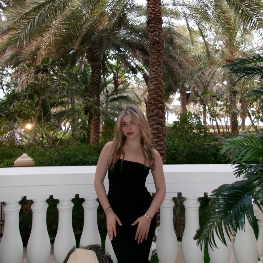 На новых снимках Микелла отдыхает в Дубае. Она позирует в чёрном платье в пол.