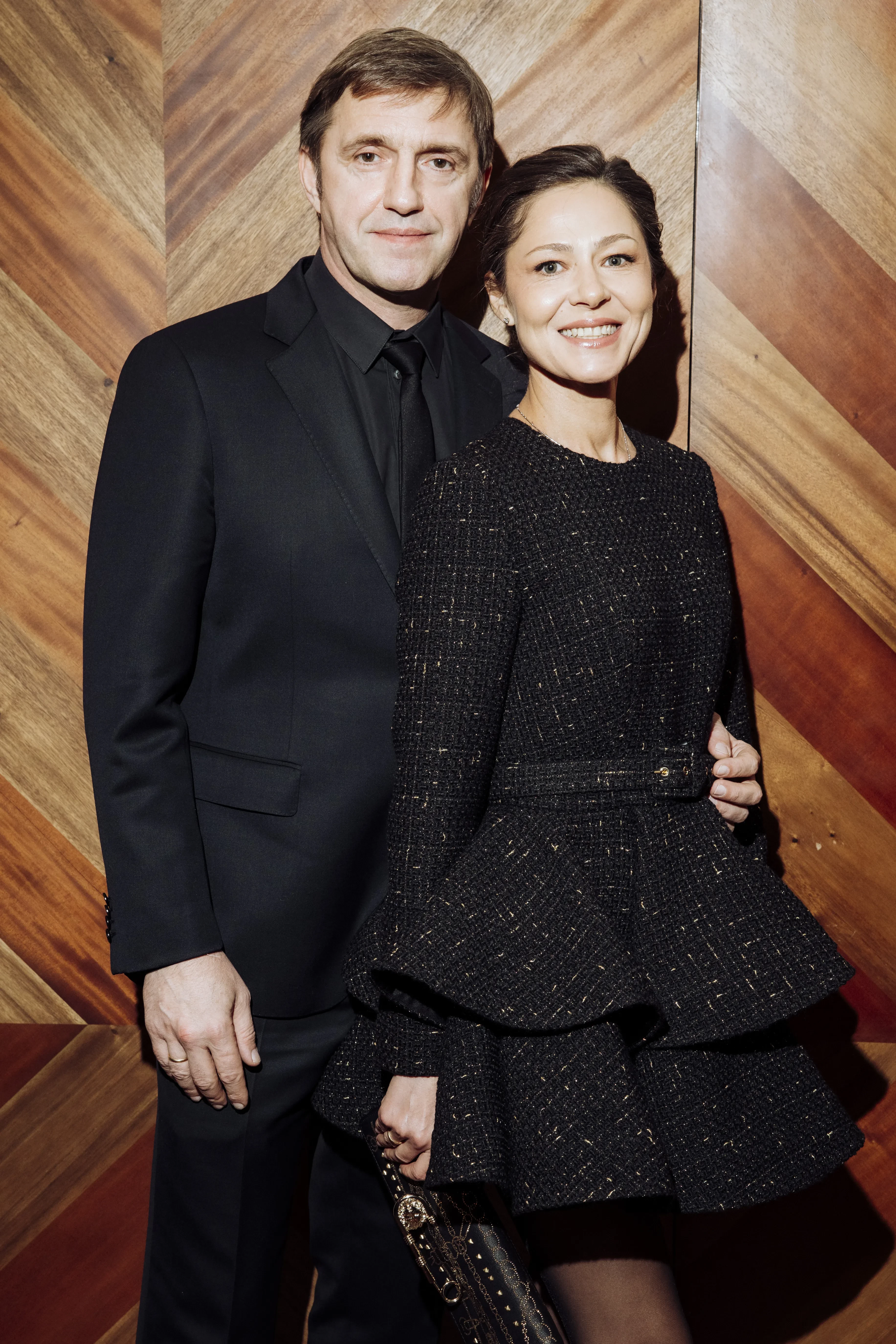 На дорожке Елена позировала в чёрном твидовом платье с расклёшенной юбкой, а Владимир надел образ total black и обнимал супругу перед фотографами.