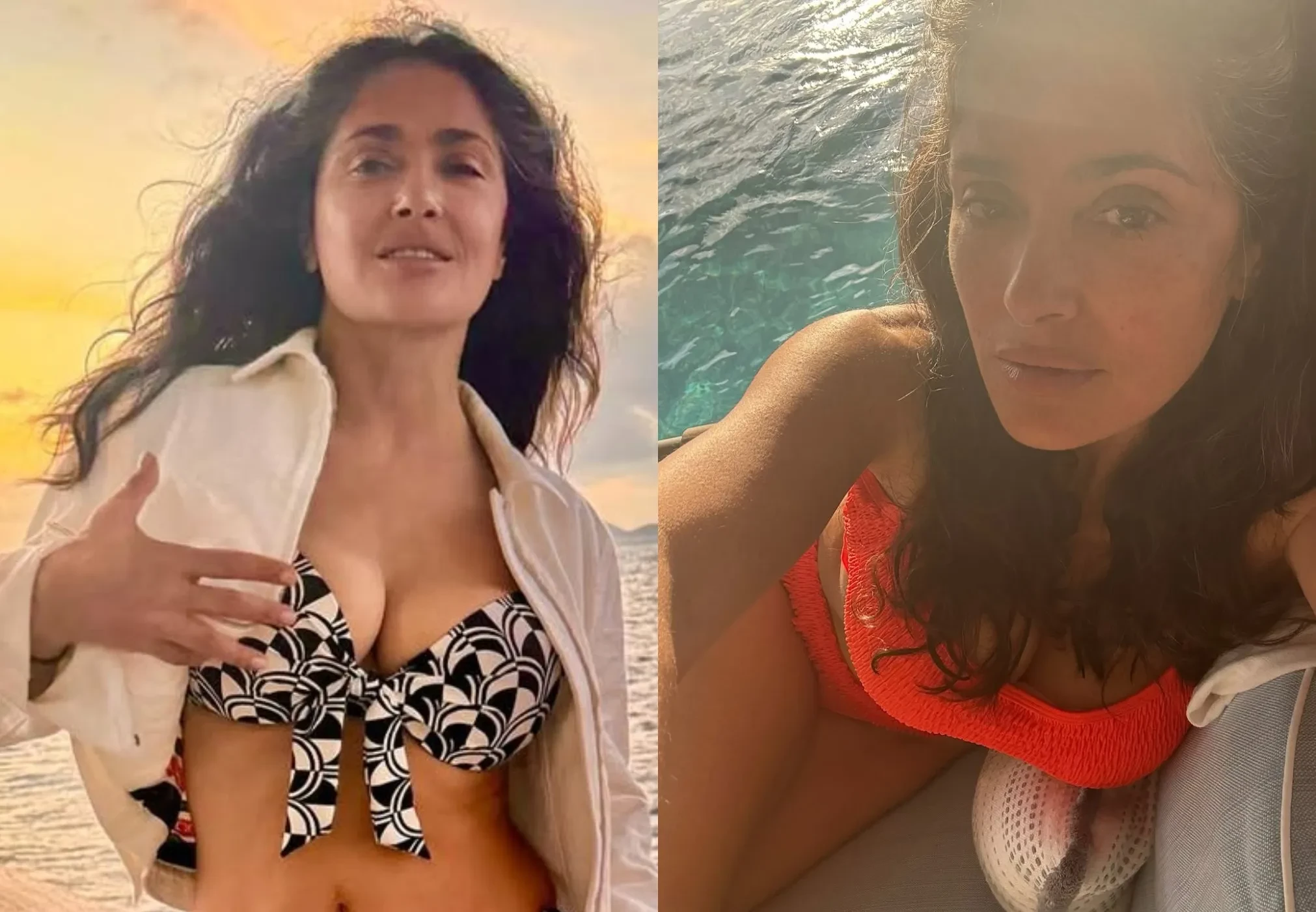 58-летняя Сальма Хайек опубликовала фото с отдыха на яхте. На снимках супруга миллиардера и владельца модного конгломерата Kering Франсуа-Анри Пино позирует в чёрно-белом и оранжевом бикини, а также наслаждается закатами и едой.